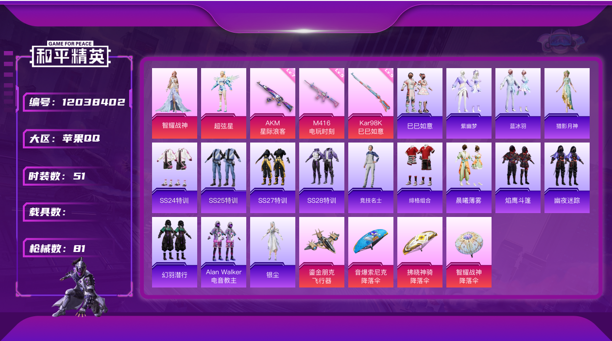 [12038402]【暑期末清货/特价急出/永久包赔】:苹果 手Q-2粉装-3特效枪-2.3w热力值-5印记-51套装-81枪皮【特效枪等级】:AKM-星际浪客(七级),M416-电玩时刻(五级),Kar98K-巳巳如意(五级)【优质套装】:角色-超弦星,角色-智耀战神【优质飞行器】:鎏金朋克飞行器