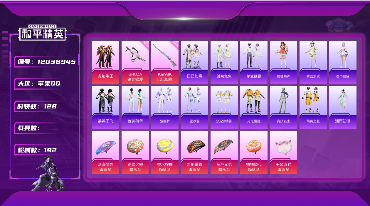 [12038945]【暑期末清货/特价急出/永久包赔】:苹果 手Q-2粉装-3特效枪-0载具-5.2w热力值-11印记-128套装-192枪皮【特效枪等级】:GROZA-镜光银凌(五级),Kar98K-巳巳如意(五级),DP-28-豹影疾电(五级)【优质套装】:粉装-炙焰牛王,角色-荧海星豚