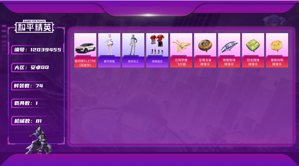 [12039455]【暑期末清货/特价急出/永久包赔】:安卓 手Q-0粉装-1特效枪-1载具-2.4w热力值-2印记-74套装-81枪皮【稀有载具】:路特斯ELETRE(花绽灰)【优质飞行器】:庄周梦蝶飞行器