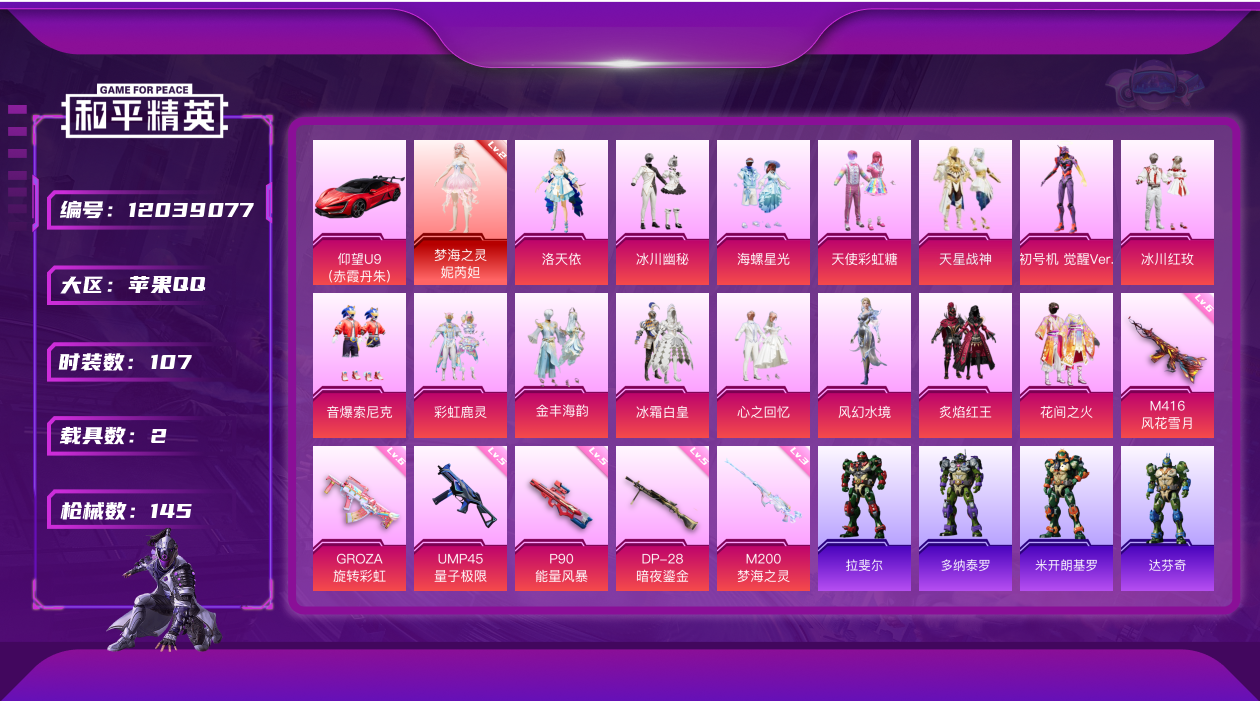 [12039077]【暑期末清货/特价急出/永久包赔/商品详情看图】:苹果 手Q-1红装-15粉装-7特效枪-1载具-5.3w热力值-7印记-107套装-145枪皮【热门品类】:套装-胖达团团,套装-沙漠守护者【角色神装等级】:梦海之灵-妮芮妲(二级)【稀有载具】:仰望U9(赤霞丹朱),僚机-萌兔起飞【特效枪等级】:M416-风花雪月(六级),GROZA-旋转彩虹(六级),UMP45-量子极限(五级),P90-能量风暴(五级),M200-梦海之灵(三级),DP-28-暗夜鎏金(五级),DP-28-豹影疾电(三级)【优质套装】:粉装-天使彩虹糖,粉装-花间之火,粉装-冰霜白皇,粉装-炙焰红王,粉装-彩虹鹿灵,角色-洛天依,粉装-冰川幽秘,粉装-冰川红玫,粉装-海螺星光,粉装-音爆索尼克,粉装-心之回忆,粉装-天星战神,角色-初号机 觉醒Ver.,角色-风幻水境,粉装-金丰海韵【优质飞行器】:春暖花开飞行器,翩跹演武飞行器,幻海精灵飞行器