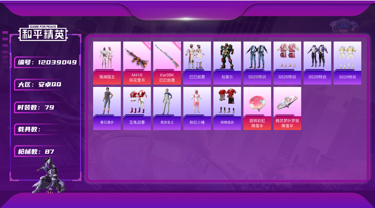 [12039049]【暑期末清货/特价急出/永久包赔】:安卓 手Q-1粉装-3特效枪-2.7w热力值-4印记-79套装-87枪皮【特效枪等级】:M416-风花雪月(五级),Kar98K-巳巳如意(五级),DP-28-豹影疾电(三级)【优质套装】:粉装-海渊国主