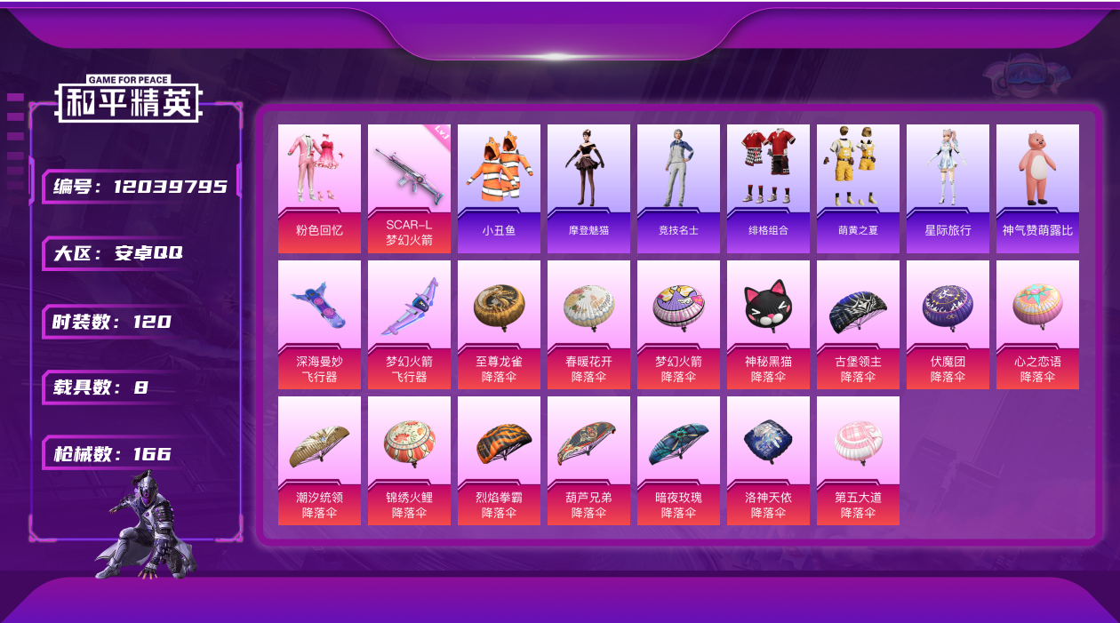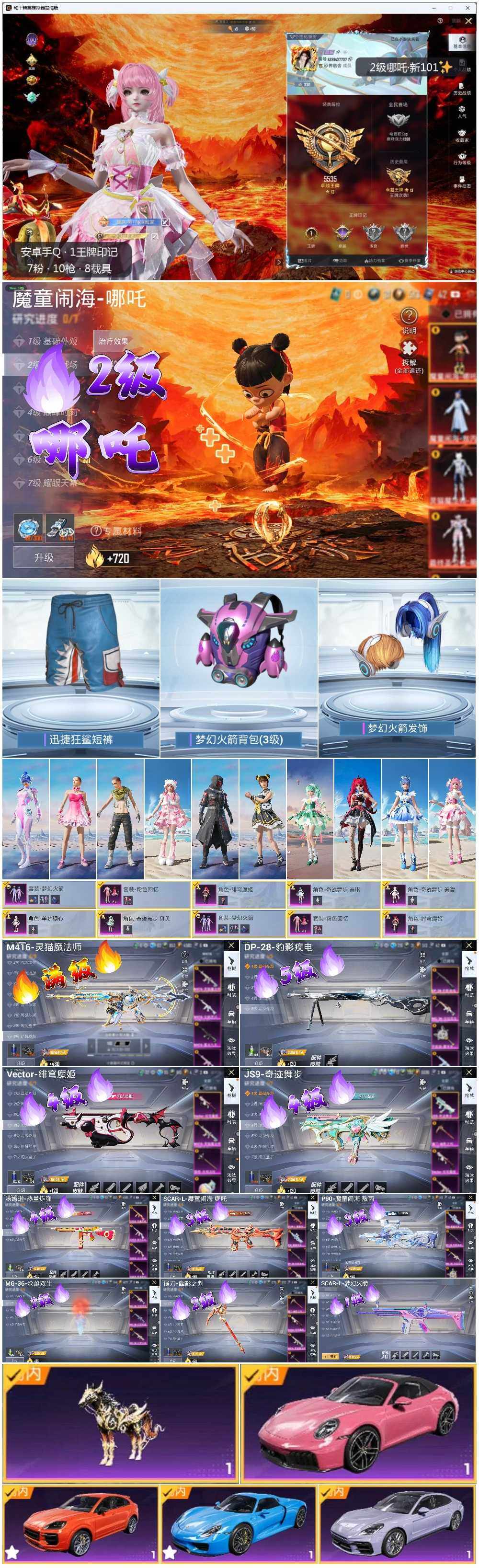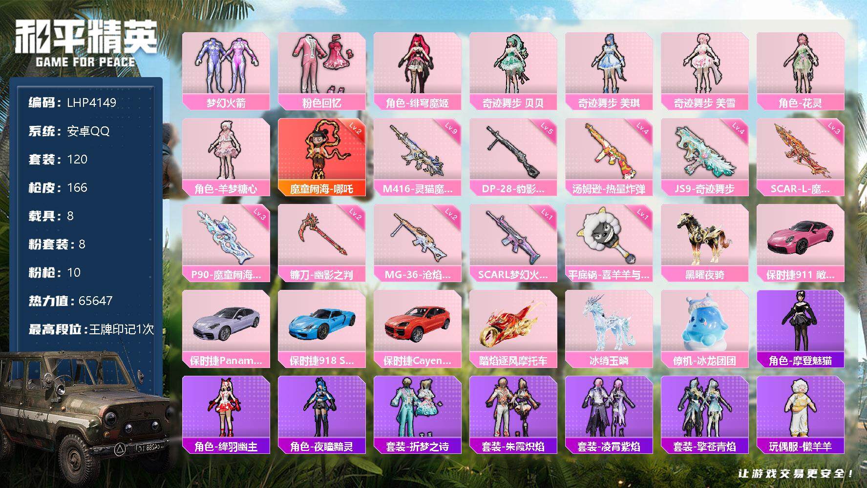 [12039795]【暑期末清货/特价急出/永久包赔】:安卓 手Q-1红装-8粉装-10特效枪-8载具-6.5w热力值-1印记-120套装-166枪皮【热门品类】:套装-小丑鱼,套装-奇异狩猎者【角色神装等级】:魔童闹海-哪吒(二级)【稀有载具】:保时捷911 敞篷版(星珀红),保时捷Panamera(星辰紫),保时捷918 Spyder(沉静蓝),保时捷Cayenne(激情红),踏焰逐风摩托车,僚机-冰龙团团,黑曜夜骑,冰绡玉鳞【特效枪等级】:SCAR-L-梦幻火箭(一级),SCAR-L-魔童闹海 哪吒(三级),M416-灵猫魔法师(九级),汤姆逊-热量炸弹(四级),JS9-奇迹舞步(四级),P90-魔童闹海 敖丙(三级),DP-28-豹影疾电(五级),MG-36-沧焰双生(二级),镰刀-幽影之判(二级),平底锅-喜羊羊与灰太狼(一级)【优质套装】:粉装-粉色回忆,粉装-梦幻火箭,角色-绯穹魔姬,角色-奇迹舞步 贝贝,角色-奇迹舞步 美琪,角色-奇迹舞步 美雪,角色-花灵,角色-羊梦糖心【优质飞行器】:深海曼妙飞行器,梦幻火箭飞行器,灵猫魔法师飞行器,飞天猪飞行器,灵珠游龙飞行器