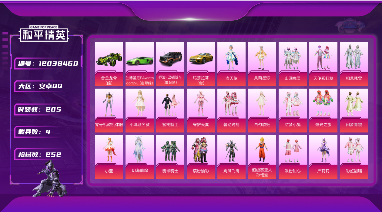 [12038460]地铁满天赋【暑期末清货/特价急出/永久包赔】:安卓 手Q-25粉装-11特效枪-4载具-9.8w热力值-11印记-205套装-252枪皮【热门品类】:套装-胖达圆圆,套装-浪客战士,大砍刀-青龙偃月刀,撬棍-龙胆亮银枪【稀有载具】:兰博基尼Aventador SVJ(翡翠绿),玛莎拉蒂Ghibli(金),乔治巴顿战车(鎏金黑),合金龙骨(绿)【特效枪等级】:AKM-梦之光华(七级),M416-心之恋语(七级),GROZA-圣辉之星(五级),AUG-暖羊咩咩(五级),UMP45-量子极限(五级),AKS-74U-星穹咏叹调(五级),Kar98K-巳巳如意(五级),M417-第五大道(五级),MG3-辉羽雀灵(五级Mk14-甜梦熊击)【优质套装】:粉装-天使彩虹糖,粉装-梦幻火箭,粉装-缤纷油彩,粉装-翡翠骑士,粉装-相思残雪,粉装-馨动时刻,粉装-飓风飞鹰,粉装-蜜桃特工,粉装-山涧鹿灵,角色-洛天依,角色-零号机款机体服,粉装-甜梦小狐,粉装-彩虹甜喵,超级赛亚人-孙悟空,粉装-飒粉甜心,角色-白勺歌姬,角色-呆萌星弥,粉装-闲梦青缨,粉装-炫光之旅,角色-小叽联名款,角色-严莉莉,角色-小蓝,角色-守护天翼,角色-幻海仙踪,粉装-星穹咏叹调【优质飞行器】:梦幻火箭飞行器,相思残雪飞行器,枪炮玫瑰飞行器,风花雪月飞行器,粉樱探戈飞行器,祥瑞锦鲤飞行器