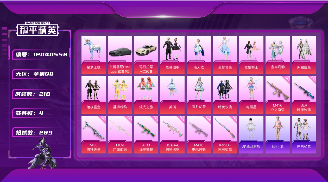 [12040558]无敌战神框2/绝世印记5/扭蛋碎片1004【特价急出/详情看图】:苹果 手Q-1红装-13粉装-10特效枪-4载具-10.9w热力值-20印记-218套装-289枪皮【红色神装等级】:魔童闹海-哪吒(二级)【热门品类】:套装-深海小丑鱼,套装-胖达圆圆,角色-2P战斗服款【粉色载具】:兰博基尼Estoque(银翼灰),玛莎拉蒂MC20(星石白),星梦玉骢,冰绡玉鳞【粉色套装】:粉装-冰霜白皇,粉装-蜜桃特工,粉装-暗夜玫瑰,角色-洛天依,粉装-垂柳戏鸭,粉装-暗夜鎏金,粉装-炫光之旅,粉装-夜幕颂歌,角色-美琪,角色-电磁星,角色-星梦奇缘,粉装-金丰海韵,粉装-雪月幻音【粉色枪皮等级】:AKM-绿萝繁花(五级),SCAR-L-锦绣绵绵(五级),M416-心之恋语(七级),M416-电玩时刻(五级),P90-魔童闹海 敖丙(二级),Kar98K-巳巳如意(五级),SLR-暗夜玫瑰(七级),DP-28-豹影疾电(五级),MG3-洛神天依(七级),PKM-江南烟雨(七级)【粉色飞行器】:龙翔九天飞行器,曦光华影飞行器,凤舞九天飞行器,飞天猪飞行器,灵珠游龙飞行器
