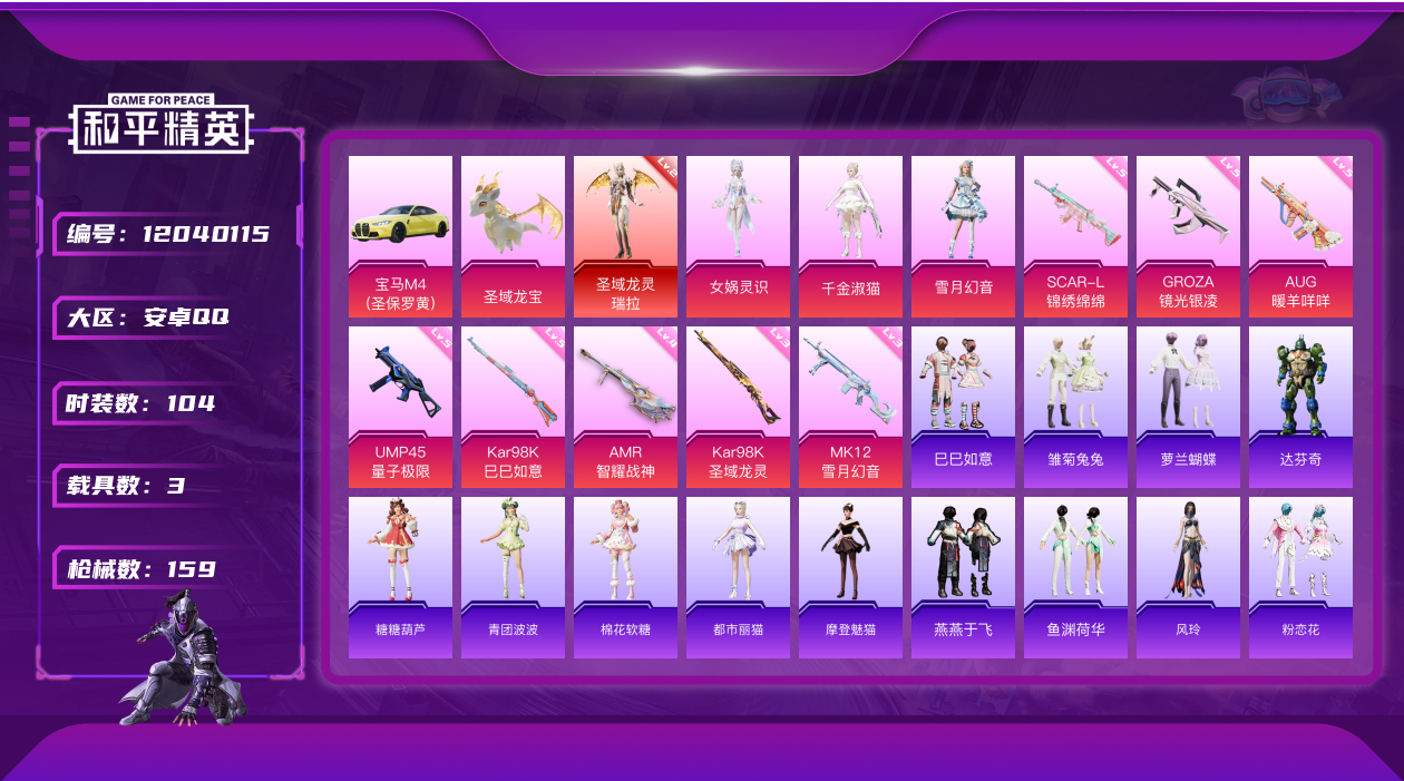 - PX_2100558- 安卓手Q-10王牌印记-6粉装-8特效枪-0载具-68694热力值-152套装-204枪皮-4卓越印记-1传奇印记 【6粉装】,缤纷油彩,星穹咏叹调,罗征,千金淑猫,闲梦青缨,猩猩队长 【8特效枪】AKM-绿萝繁花-5级 SCAR-L-锦绣绵绵-5级 M416-五爪金龙-7级 GROZA-镜光银凌-5级 M762-青锋波束-5级 Kar98K-巳巳如意-5级 AMR-智耀战