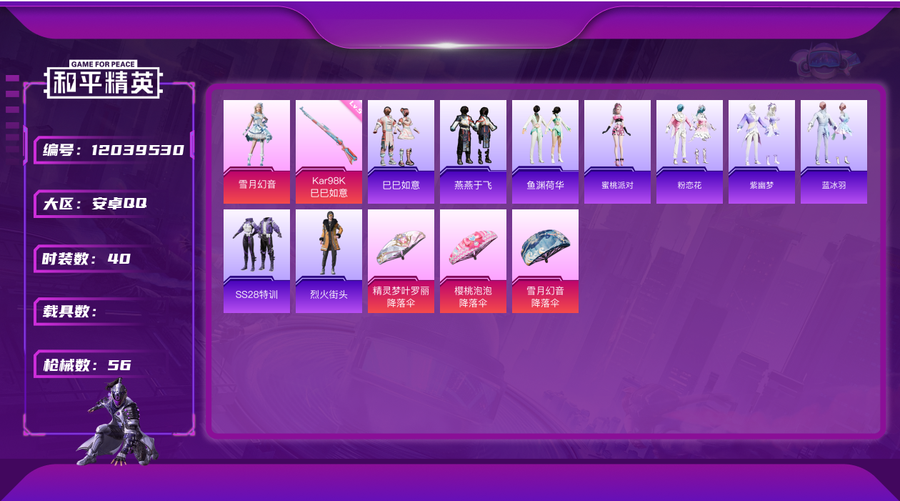 [12039530]【暑期末清货/特价急出/永久包赔】:安卓 手Q-2粉装-1特效枪-0载具-1.7w热力值-3印记-40套装-56枪皮【特效枪等级】:Kar98K-巳巳如意(五级)【优质套装】:粉装-雪月幻音,粉装-幻彩电音