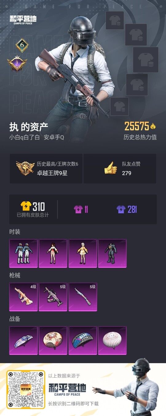 - PX_2100805-??/枪械9/装备328/战备188/王牌印记16/热力值89455/七级AKM-梦之光华/七级SCAR-L-青春物语/七级UMP45-相思残雪/七级Vector-灵感创作师/五级Kar98K-巳巳如意/四级M417-第五大道/四级MK20-H-海螺星光/四级MG3-炙焰牛王/未来战士/怪诞乔克/甜心巧克力/宝贝奶油派/天使彩虹糖/梦幻火箭/缤纷油彩/放客神游/花间之火/冰霜