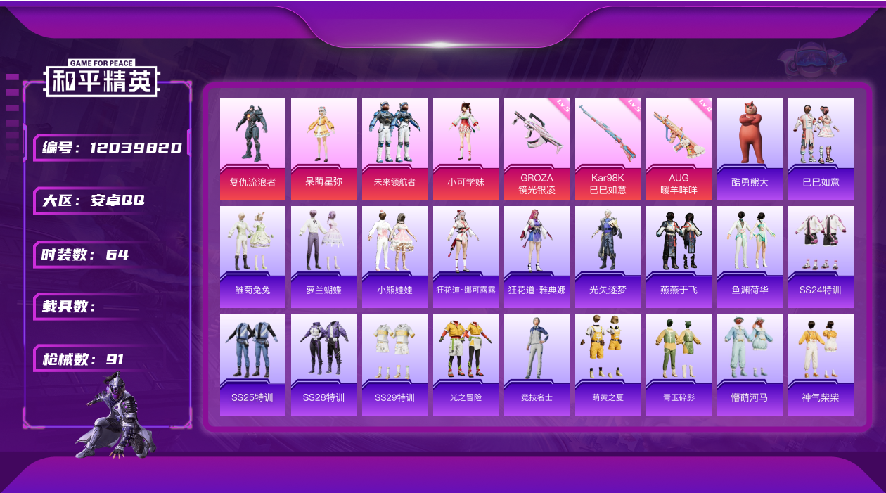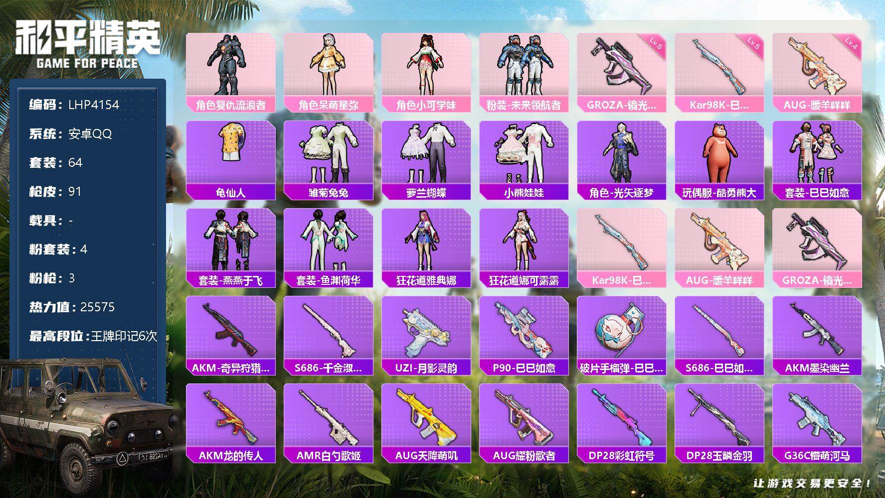 [12039820]【暑期末清货/特价急出/永久包赔】:安卓 手Q-4粉装-3特效枪-2.5w热力值-6印记-64套装-91枪皮【特效枪等级】:GROZA-镜光银凌(五级),AUG-暖羊咩咩(四级),Kar98K-巳巳如意(五级【优质套装】:角色-复仇流浪者,角色-呆萌星弥,角色-小可学妹,粉装-未来领航者