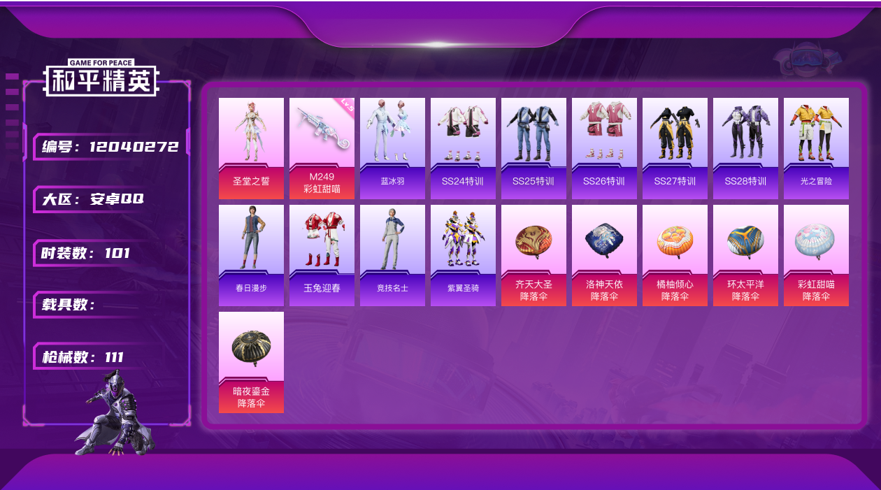 - PX_2101271-??/枪械21/装备493/载具3/战备202/王牌印记22/热力值129246/五级AKM-炫紫旋律/五级AKM-梦之光华/五级SCAR-L-梦幻火箭/四级SCAR-L-童趣迷兔/五级M416-心之恋语/四级GROZA-焦糖拿铁/五级AUG-超新星/四级M762-甜蜜誓约/三级M762-激战未来/四级UZI-绮梦青鸾/三级UMP45-相思残雪/三级UMP45-宇宙意志/五级
