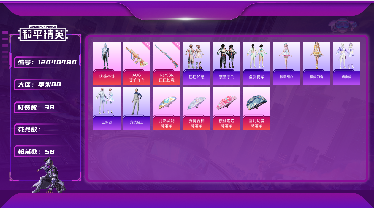 [12040480]【特价急出/详情看图】:苹果 手Q-3粉装-3特效枪-1.6w热力值-4印记-38套装-58枪皮【粉色套装】:角色-伏羲圣卦,角色-冷漠罗丽,角色-罗征【粉色枪皮等级】:AUG-暖羊咩咩(五级),Kar98K-巳巳如意(五级),DP-28-豹影疾电(五级)