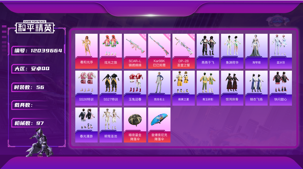 - PX_2099920- 苹果手Q-24王牌印记-有战神框-14粉装-10特效枪-6载具-热力值-286套装-345枪皮-0卓越印记-0传奇印记 【14粉装】,梦幻火箭,缤纷油彩,放客神游,新星烈龙,蝶舞迷情,幻彩电音,荧海星豚,极致幻想,暗夜玫瑰,甜蜜誓约,诡面斩,金属狂野,天禅智恒,金风玉露 【10特效枪】AKM-炫紫旋律-7级 M416-五爪金龙-7级 M416-灵猫魔法师-3级 M416-心