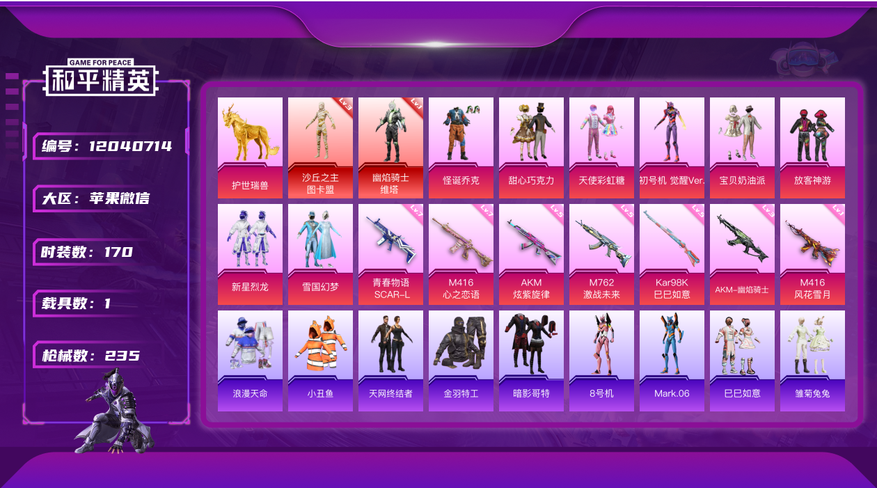 - PX_2088316- 可二次 苹果手Q-13王牌印记-16粉装-5特效枪-1载具-76250热力值-174套装-208枪皮-2卓越印记-1传奇印记, 【16粉装】,雪国幻梦,梦幻火箭,宝贝奶油派,天使彩虹糖,缤纷油彩,放客神游,洛天依,星穹咏叹调,智能音符,寒光使者,炙焰红王,显圣真君,金风玉露,暗夜鎏金,蜜桃特工,蝶舞蔷薇, 【5特效枪】,AKM-梦之光华-7级,M416-五爪金龙-7级,GR