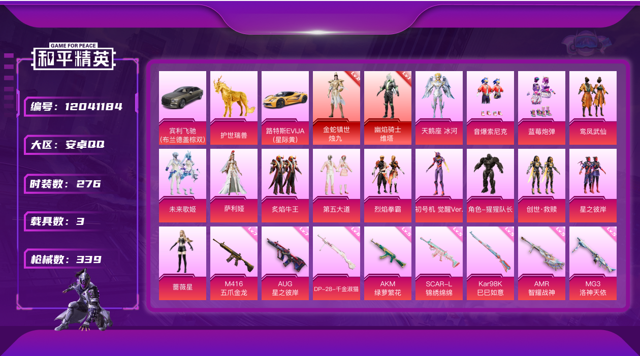 [12041184]扭蛋碎片549/地铁满天赋【特价急出/详情看图】:安卓 手Q-2神装-15粉装-13特效枪-3载具-5粉色飞行器-13.6w热力值-16王牌印记-276套装-339枪皮【红色神装等级】:金蛇镇世-烛九(二级),幽焰骑士-维塔(一级)【热门品类】:粉装-音爆索尼克,套装-派对舞王,套装-深海小丑鱼,套装-小丑鱼,套装-奇异狩猎者,套装-龟仙人,套装-浪漫波比,套装-粉红小猪,角色-8号机,角色-Mark.06【粉色载具】:路特斯EVIJA(星际黄),宾利飞驰(布罗德盖棕双色),护世瑞兽【粉色套装】:粉装-星之彼岸,粉装-烈焰拳霸,粉装-蓝莓炮弹,粉装-炙焰牛王,粉装-鸾凤武仙,粉装-音爆索尼克,粉装-第五大道,粉装-未来歌姬,角色-猩猩队长,角色-蔷薇星,套装-创世·救赎,角色-初号机 觉醒Ver.,角色-萨利娅,角色-天鹅座 冰河,角色-绯穹魔姬【粉色枪皮等级】:AKM-绿萝繁花(五级),AKM-幽焰骑士(三级),SCAR-L-锦绣绵绵(五级),SCAR-L-金蛇镇世(三级),M416-五爪金龙(七级),M416-风花雪月(三级),AUG-星之彼岸(七级),Kar98K-巳巳如意(五级),AMR-智耀战神(五级),SVD-月影灵韵(三级),DP-28-千金淑猫(六级),DP-28-豹影疾电(五级),MG3-洛神天依(五级)【粉色飞行器】:梦幻火箭飞行器,庄周梦蝶飞行器,镜域双华-灵镜之阶,万象金身飞行器,灵猫魔法师飞行器