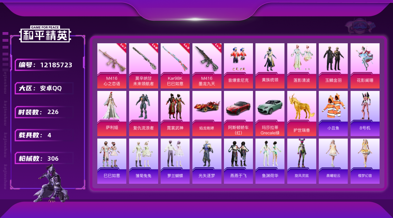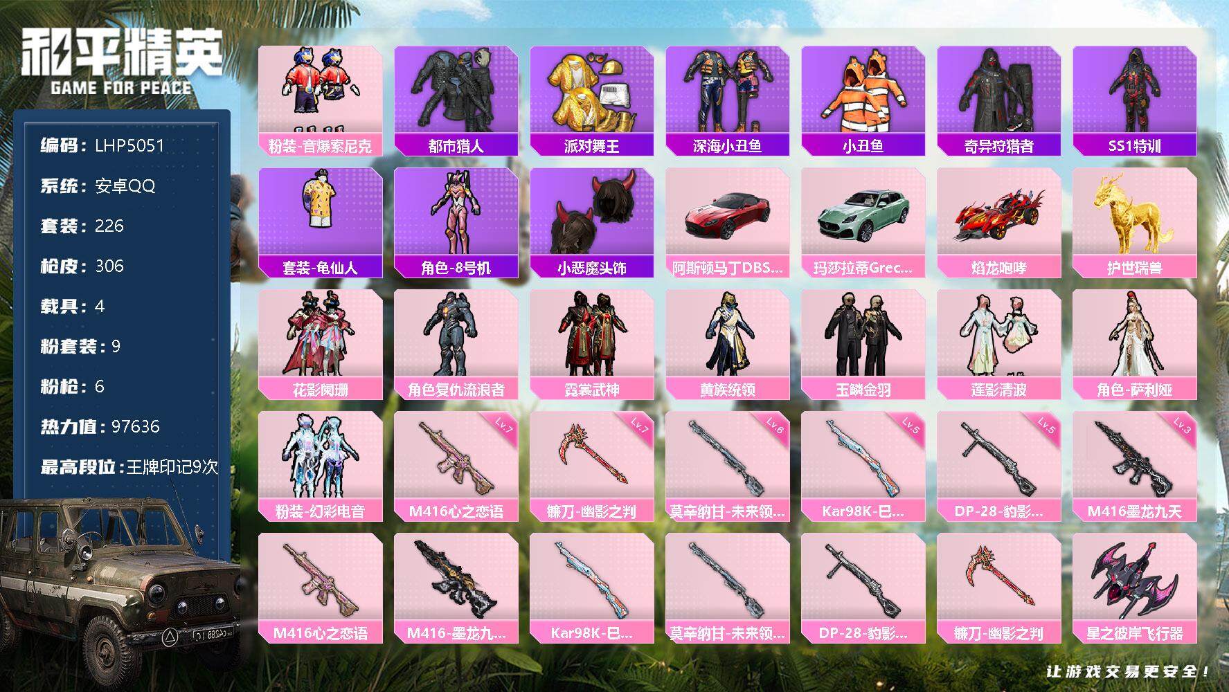 [12185723]素材身法号【特价急出/详情看图】:安卓 手Q-9粉装-6特效枪-4载具-10粉色飞行器-9.7w热力值-9王牌印记-226套装-306枪皮【热门品类】:粉装-音爆索尼克,套装-都市猎人,套装-派对舞王,套装-深海小丑鱼,套装-小丑鱼,套装-奇异狩猎者,套装-SS1特训,套装-龟仙人,角色-8号机,小恶魔头饰【粉色载具】:阿斯顿马丁DBS(红),玛莎拉蒂Grecale(薄荷绿),焰龙咆哮,护世瑞兽【粉色套装】:粉装-花影阑珊,角色-复仇流浪者,粉装-霓裳武神,粉装-音爆索尼克,粉装-黄族统领,粉装-玉鳞金羽,粉装-莲影清波,角色-萨利娅,粉装-幻彩电音【粉色枪皮等级】:M416-心之恋语(七级),M416-墨龙九天(三级),Kar98K-巳巳如意(五级),莫辛纳甘-未来领航者(六级),DP-28-豹影疾电(五级),镰刀-幽影之判(七级)【粉色飞行器】:星之彼岸飞行器,星际浪客飞行器,沙丘之主天马,凤舞九天飞行器,星月云朵飞行器,圣域金龙飞行器,灵猫魔法师飞行器,飞天猪飞行器,灵珠游龙飞行器