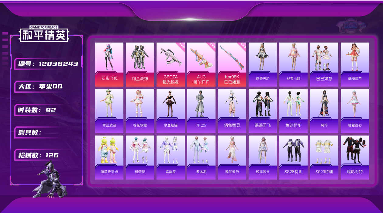 [12038243]【暑期末清货/特价急出/永久包赔】:苹果 手Q-5粉装-8特效枪-0载具-4.1w热力值-6印记-92套装-126枪皮【特效枪等级】:GROZA-镜光银凌(五级),AUG-暖羊咩咩(五级),Vector-最终圣卫者(三级),AKS-74U-星穹咏叹调(五级),P90-冷漠罗丽(四级),Kar98K-巳巳如意(五级),MG3-辉羽雀灵(三级)【优质套装】:粉装-梦幻火箭,粉装-绚金战神,粉装-幻影飞狐,粉装-星穹咏叹调,角色-冷漠罗丽【优质飞行器】:齐天大圣飞行器,镜光幻境飞行翼,凤舞九天飞行器,圣域金龙飞行器,雀灵庇佑飞行器,终晖之翼飞行器,灵猫魔法师飞行器