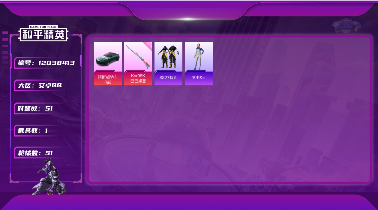 [12038413]【暑期末清货/特价急出/永久包赔】:安卓 手Q-0粉装-1特效枪-1载具-1.6w热力值-1印记-51套装-51枪皮【稀有载具】:阿斯顿马丁DBS(绿)【特效枪等级】:Kar98K-巳巳如意(五级)