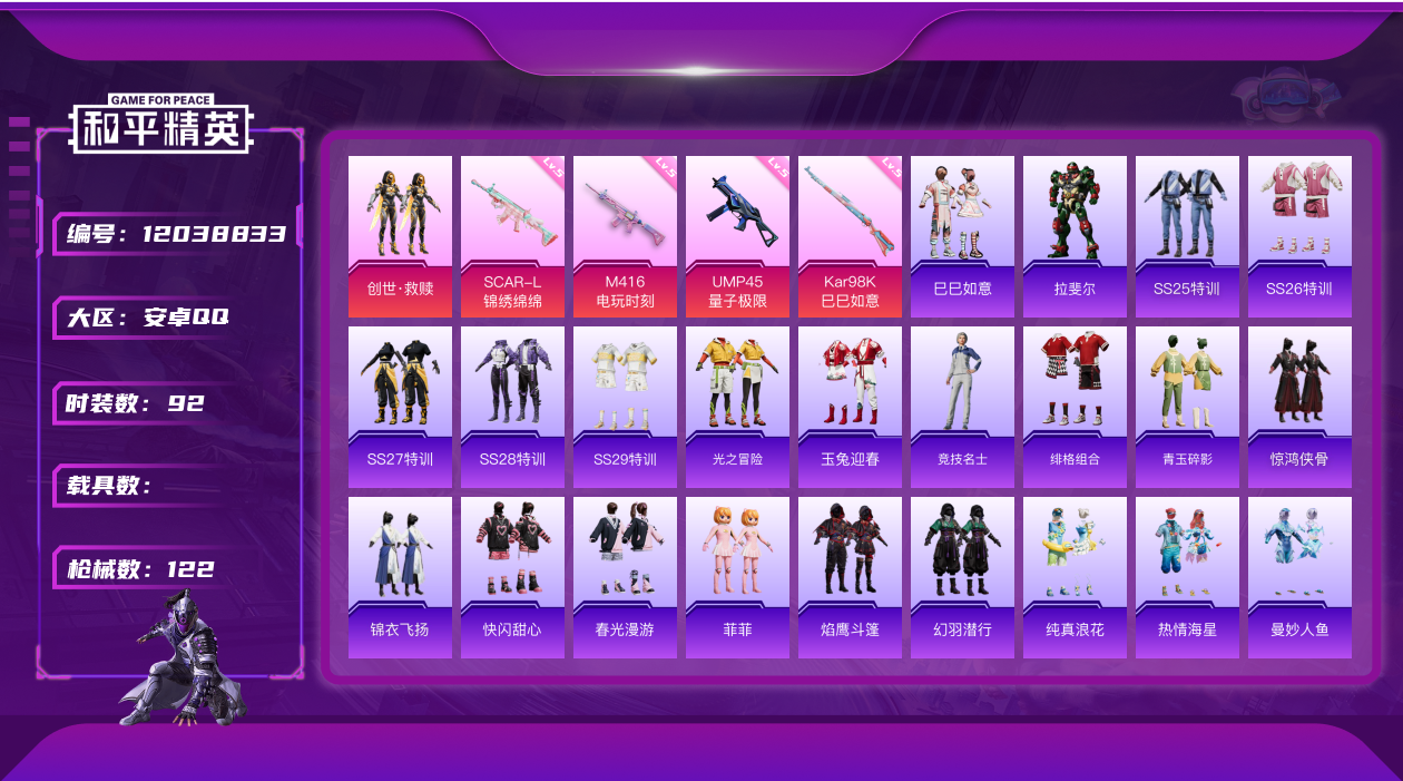 [12038833]【暑期末清货/特价急出/永久包赔】:安卓 手Q-1粉装-5特效枪-3.2w热力值-2印记-92套装-122枪皮【特效枪等级】:SCAR-L-锦绣绵绵(五级),M416-电玩时刻(五级),UMP45-量子极限(五级),Kar98K-巳巳如意(五级),DP-28-豹影疾电(一级)【优质套装】:套装-创世·救赎