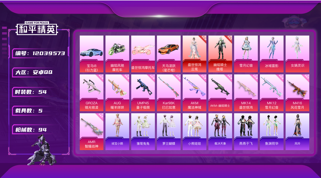 [12039573]扭蛋碎片708【暑期末清货/特价急出/永久包赔】:安卓 手Q-2红装-5粉装-11特效枪-5载具-4.4w热力值-1印记-54套装-94枪皮【角色神装等级】:盛世惊鸿-云鸾(二级),幽焰骑士-维塔(一级)【稀有载具】:宝马i8(引力蓝),天马凌跃(星芒橙),幽焰风驰摩托车,盛世惊鸿摩托车,黑曜夜骑【稀有载具等级】:宝马i8(引力蓝)(三级)【特效枪等级】:AKM-魔法神域(三级),AKM-幽焰骑士(三级),M416-风花雪月(一级),M416-灵猫魔法师(六级),GROZA-镜光银凌(五级),AUG-暖羊咩咩(五级),UMP45-量子极限(五级),Kar98K-巳巳如意(五级),Mk14-盛世惊鸿(三级),AMR-智耀战神(一级),MK12-雪月幻音(三级)【优质套装】:角色-冰域雷影,角色-女娲灵识,粉装-雪月幻音,角色-绯穹魔姬,角色-奇迹舞步 美琪【优质飞行器】:魔法神域飞行器,幽焰列车飞行器,脆鲨七海飞行器,凤舞九天飞行器,灵猫魔法师飞行器