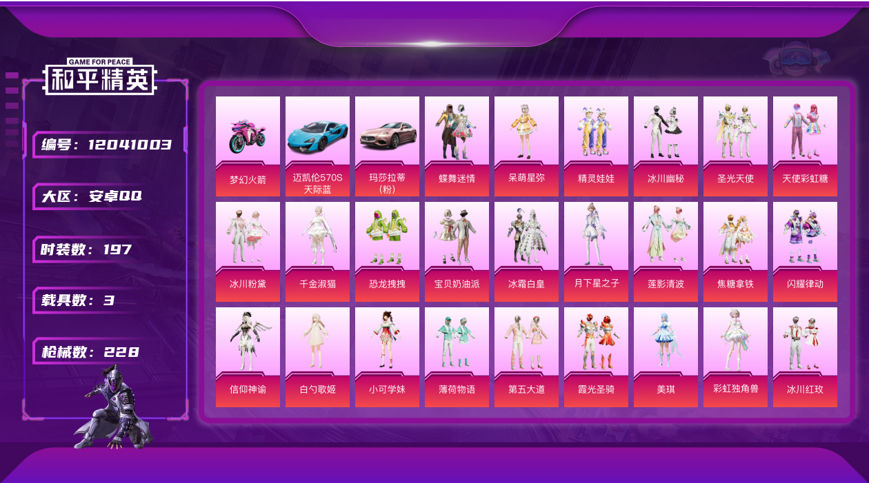 [12041003]无敌战神框1【特价急出/详情看图】:安卓 手Q-无敌战神框-28粉装-12特效枪-3载具-7粉色飞行器-8.9w热力值-15王牌印记-197套装-228枪皮【热门品类】:粉装-梦幻火箭,粉装-童趣迷兔,套装-浪漫天命,套装-都市猎人,套装-奇异狩猎者,套装-龟仙人,套装-红熊茄茄【粉色载具】:玛莎拉蒂Ghibli(粉),迈凯伦570S(天际蓝),双人摩托-梦幻火箭【粉色套装】:粉装-宝贝奶油派,粉装-天使彩虹糖,粉装-蝶舞迷情,粉装-梦幻火箭,粉装-冰霜白皇,粉装-童趣迷兔,粉装-精灵娃娃,粉装-焦糖拿铁,粉装-薄荷物语,粉装-恐龙拽拽,粉装-闪耀律动,粉装-圣光天使,粉装-冰川粉黛,粉装-冰川幽秘,粉装-冰川红玫,粉装-霞光圣骑,粉装-第五大道,角色-白勺歌姬,角色-呆萌星弥,角色-小可学妹,粉装-莲影清波,角色-美琪,角色-鸢尾晶梦,角色-千金淑猫,角色-信仰神谕,角色-晶梦幻蝶,角色-彩虹独角兽,角色-月下星之子【粉色枪皮等级】:AKM-百合蜜语(五级),SCAR-L-青春物语(七级),M416-暖熊萌萌(七级),M762-甜心娃娃(五级),UMP45-恐龙拽拽(四级),Kar98K-巳巳如意(五级),M24-暗星紫秘(四级),M417-第五大道(一级),DP-28-幻梦音符(四级),DP-28-千金淑猫(四级),DP-28-豹影疾电(一级),烟雾弹-丁香清露(五级)【粉色飞行器】:酣梦熊熊飞行器,春暖花开飞行器,梦幻火箭飞行器,鸢尾晶梦飞行器,幻梦之森飞行器,彩虹独角兽飞行器,月下星之子飞行器