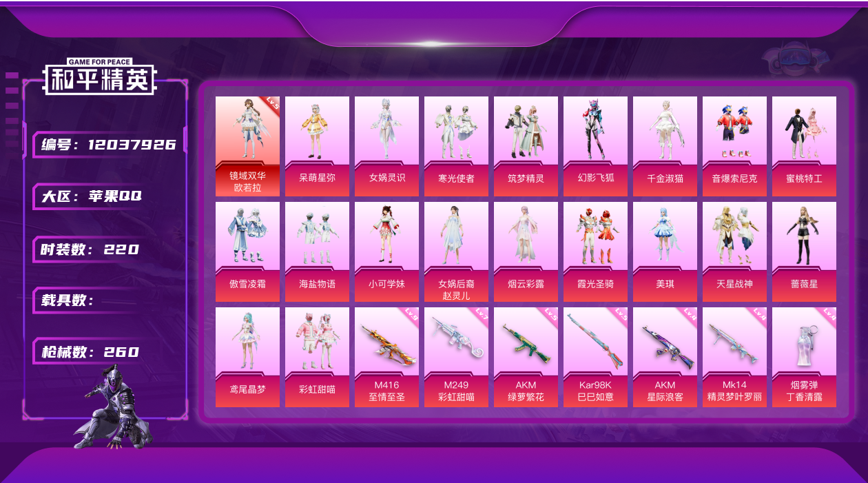 [12037926]地铁满天赋【暑期末清货/特价急出/永久包赔】:苹果 手Q-1红装-20粉装-10特效枪-0载具-9.9w热力值-18印记-220套装-260枪皮【热门品类】:角色-军刀雅典娜【角色神装等级】:镜域双华-欧若拉(五级)【特效枪等级】:AKM-星际浪客(四级),AKM-绿萝繁花(五级),M416-至情至圣(九级),UMP45-宇宙意志(三级),P90-金丰海韵(三级),Kar98K-巳巳如意(五级),M24-镜域双华(一级),Mk14-精灵梦叶罗丽(四级),M249-彩虹甜喵(七级),烟雾弹-丁香清露(四级)【优质套装】:粉装-蜜桃特工,粉装-海盐物语,粉装-筑梦精灵,粉装-傲雪凌霜,粉装-彩虹甜喵,女娲后裔-赵灵儿,粉装-霞光圣骑,粉装-寒光使者,粉装-音爆索尼克,角色-呆萌星弥,角色-小可学妹,粉装-天星战神,角色-蔷薇星,角色-烟云彩露,角色-美琪,角色-鸢尾晶梦,角色-千金淑猫,角色-女娲灵识,粉装-幻影飞狐,粉装-幻彩电音【优质飞行器】:仙剑飞行器,千面幻镜飞行器,镜域双华-灵镜之阶,凤舞九天飞行器,月下星之子飞行器