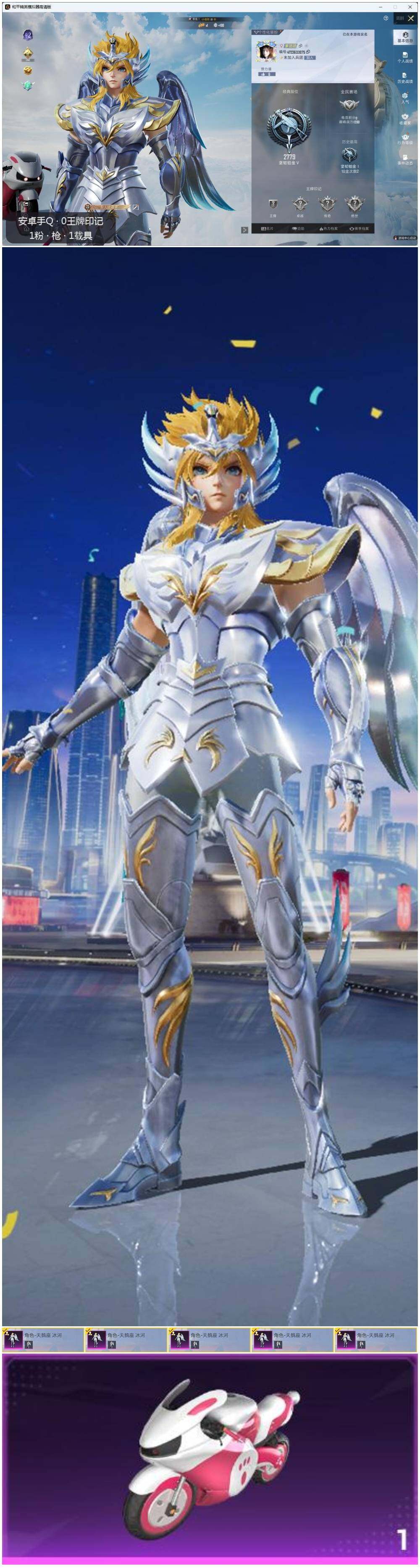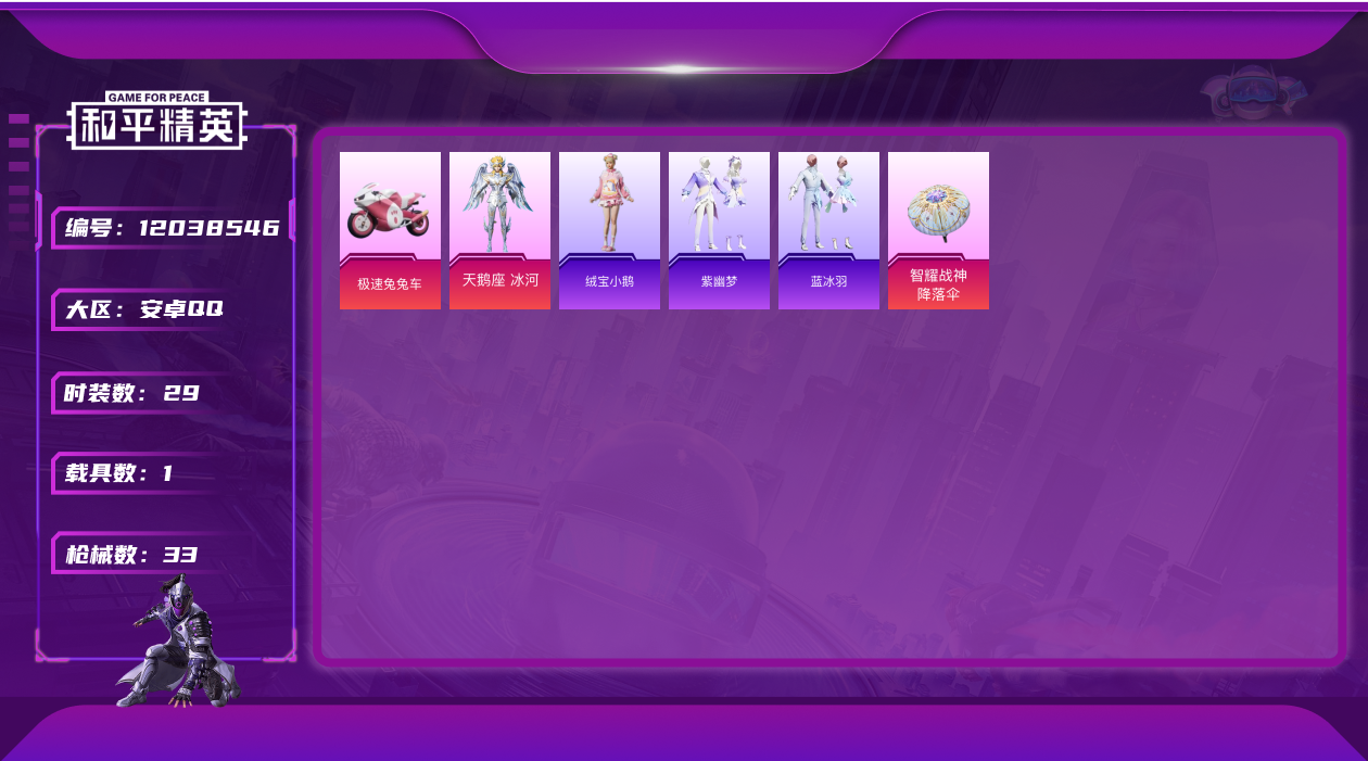 [12038546]暑期末清货/特价急出/永久包赔【商品标题】:安卓 手Q-1粉装-1特效枪-1载具-1w热力值-0印记-29套装-33枪皮【稀有载具】:极速兔兔车【优质套装】:角色-天鹅座 冰河