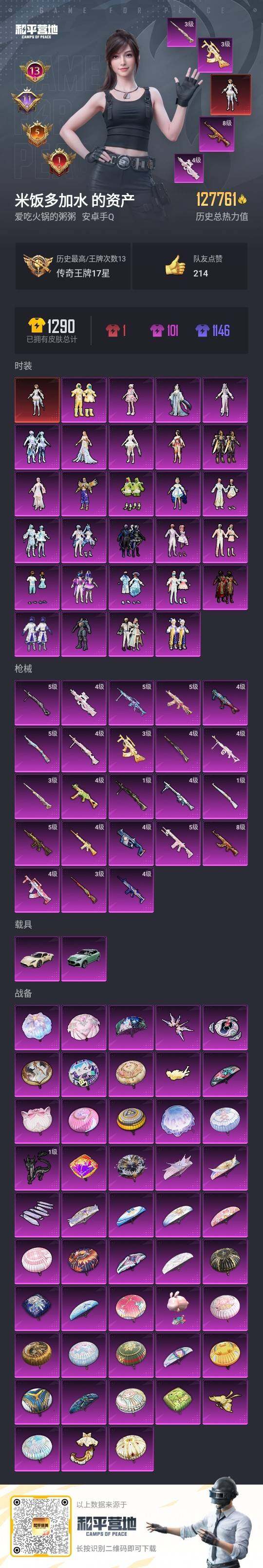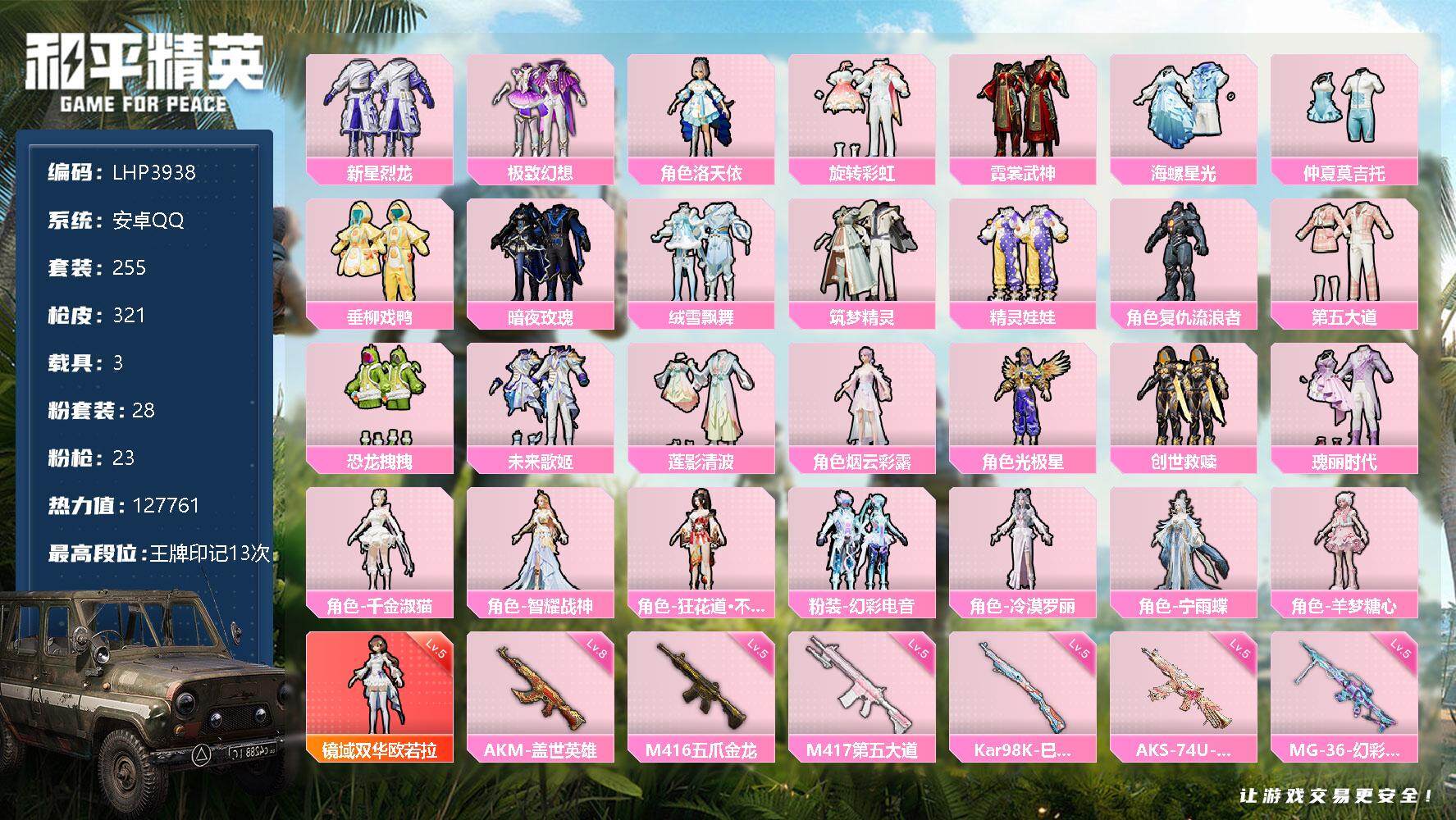 - PX_2088542- 可二次 安卓手Q-8王牌印记-2粉装-6特效枪-2载具-41610热力值-81套装-120枪皮-1卓越印记-0传奇印记, 【2粉装】,幻影飞狐,金曜白虎, 【6特效枪】,M416-五爪金龙-7级,GROZA-镜光银凌-5级,Kar98K-巳巳如意-5级,Kar98K-伏魔团-3级,DBS-幻影飞狐-5级,MG-36-幻彩电音-2级, 【4稀有紫装】,派对舞王,暗影哥特,浪漫