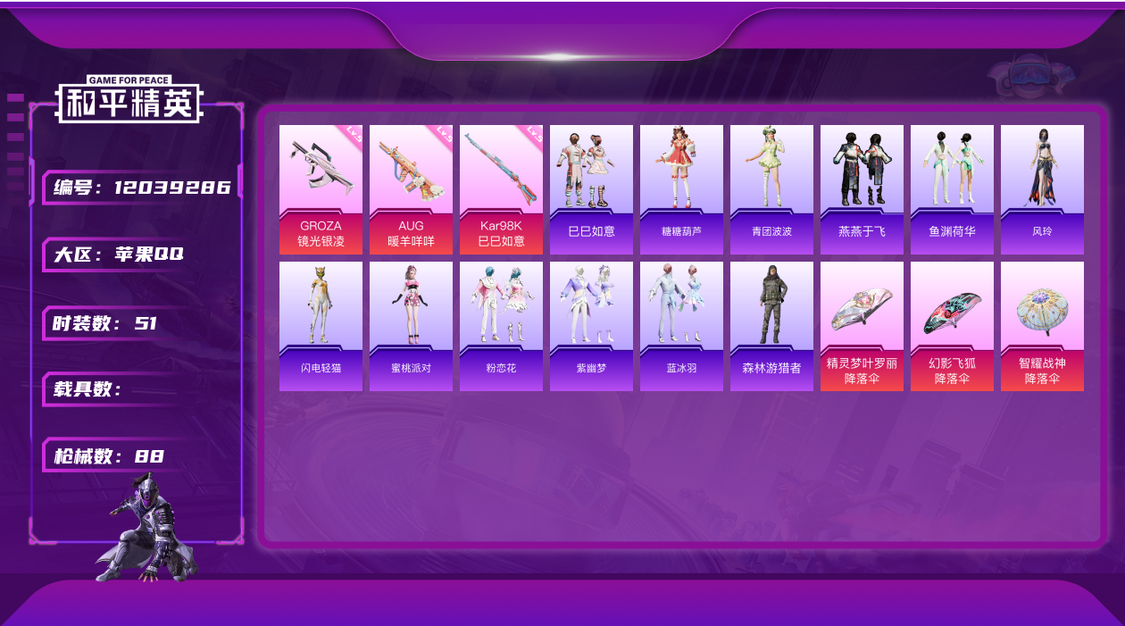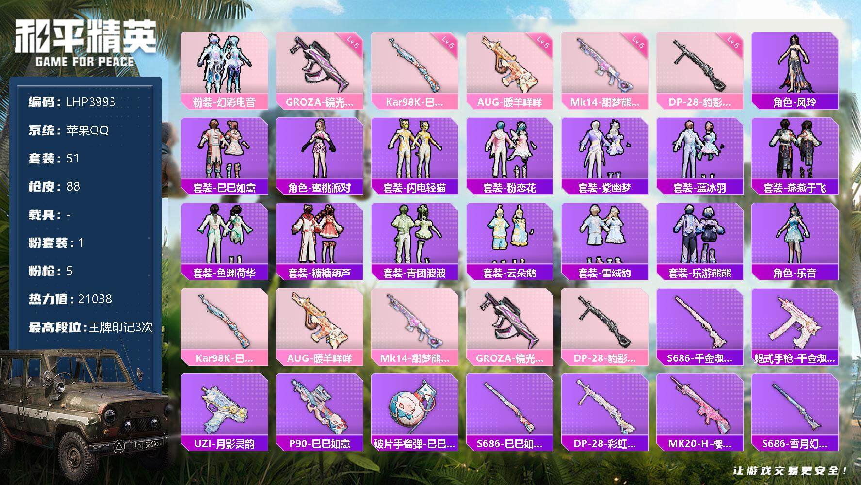 [12039286]地铁满天赋【暑期末清货/特价急出/永久包赔】:苹果 手Q-1粉装-5特效枪-0载具-2.1w热力值-3印记-51套装-88枪皮【特效枪等级】:GROZA-镜光银凌(五级),AUG-暖羊咩咩(五级),Kar98K-巳巳如意(五级),Mk14-甜梦熊击(五级),DP-28-豹影疾电(五级)【优质套装】:粉装-幻彩电音