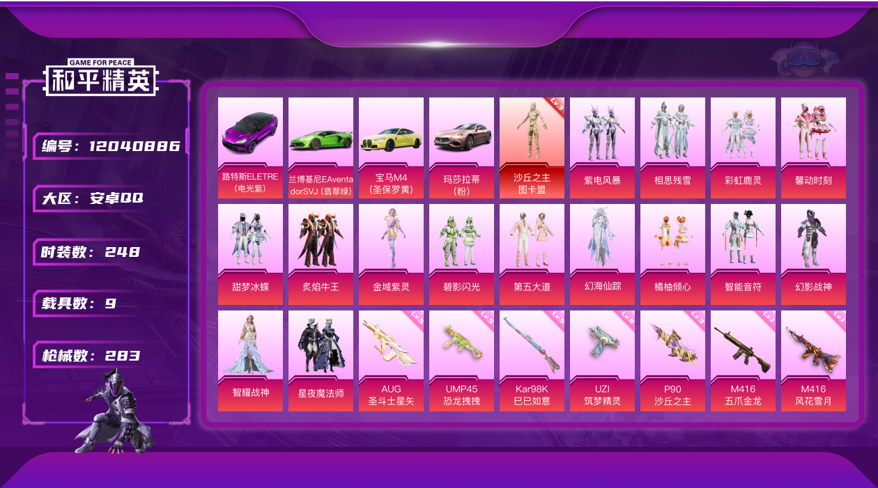 - PX_2090146- 安卓手Q-13王牌印记-12粉装-7特效枪-3载具-67648热力值-158套装-185枪皮-5卓越印记-0传奇印记 【12粉装】,放客神游,幻彩电音,憨憨奶龙,阿尔茜,小可学妹,岚岚物语,冰川幽秘,冰霜白皇,彩虹鹿灵,暗夜鎏金,未来歌姬,金丰海韵 【7特效枪】AKM-绿萝繁花-5级 SCAR-L-锦绣绵绵-5级 M416-五爪金龙-6级 AUG-暖羊咩咩-5级 Kar98