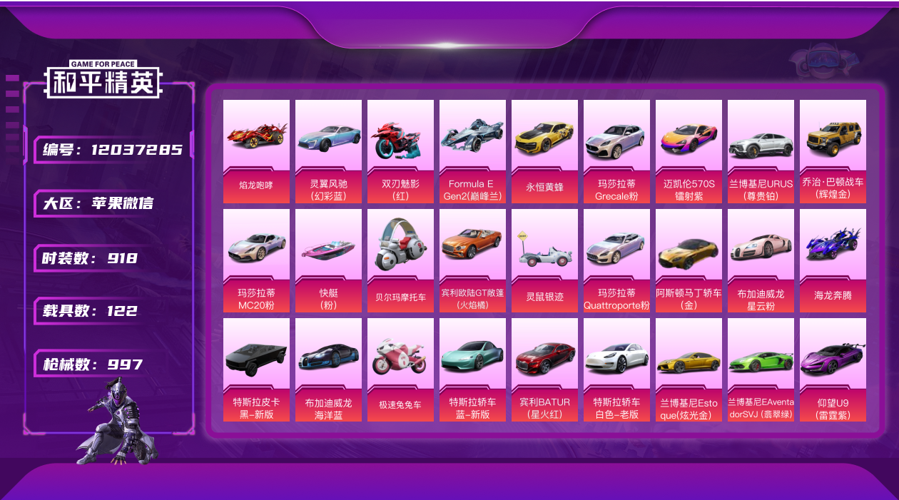 [12037285]全网最高热力ID雪碧/390万热力/超多战神框【商品标题】:苹果 微信-230粉装-122特效枪-122载具-3879580热力值-24印记-918套装-997枪皮