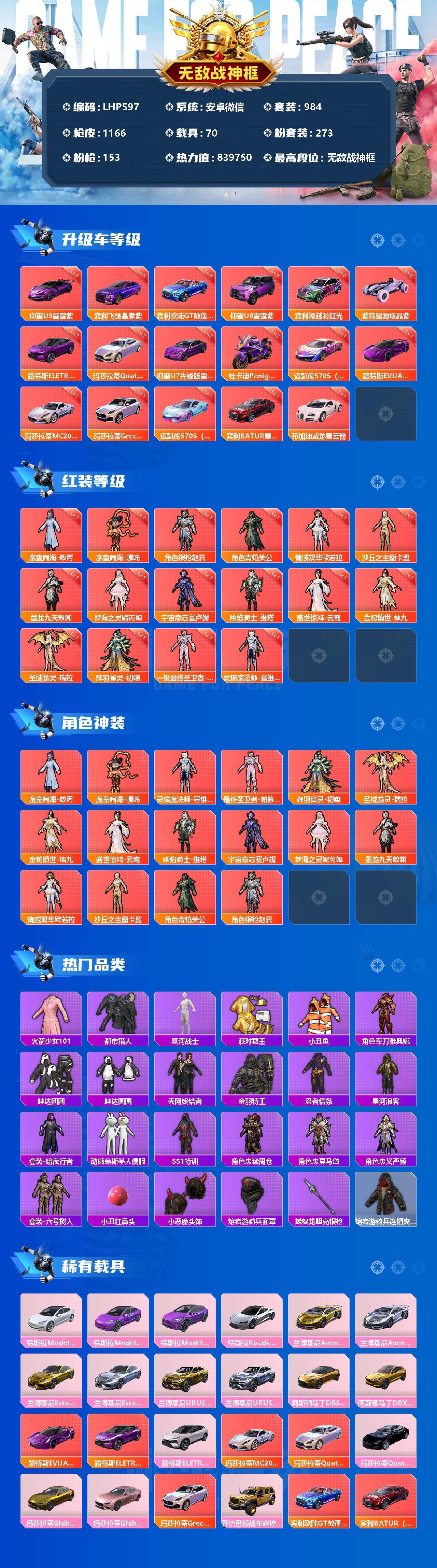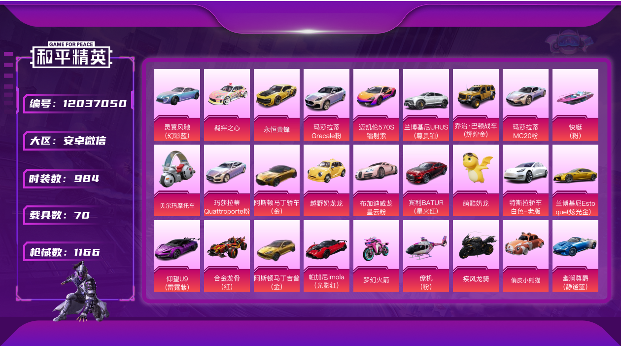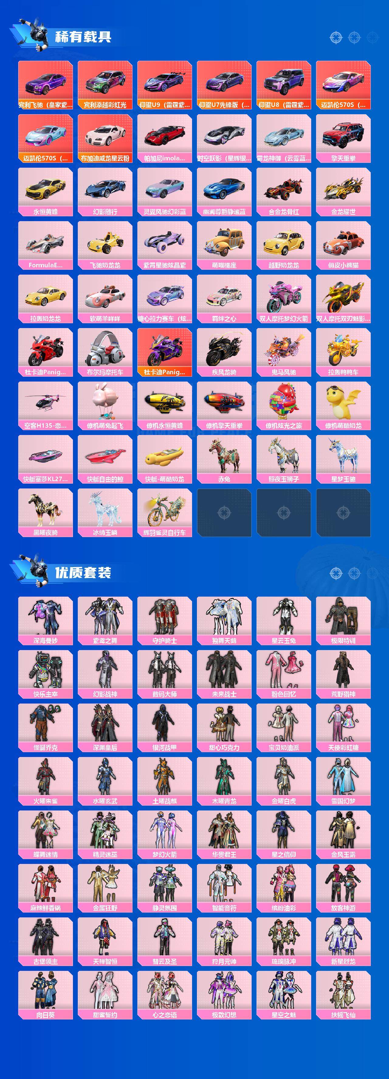 [12037050]16套神装满级红装可随意切换-273粉装-153特效枪-72载具-124粉色飞行器-84万热力值-984套装-1166枪皮 【红色载具】:路特斯ELETRE(电光紫)(二级),路特斯EVIJA(电光紫)(一级),玛莎拉蒂MC20(幻星粉)(一级),玛莎拉蒂Quattroporte(幻星粉)(二级),玛莎拉蒂Grecale(幻星粉)(一级),迈凯伦570S(镭射紫)(一级),迈凯伦570S(炫冰蓝)(一级),宾利添越(彩虹光)(三级),宾利BATUR(星火红)(一级),宾利飞驰(皇家紫)(五级),宾利欧陆GT敞篷(深空蓝)(五级),杜卡迪 Panigale V4(霓虹紫)(二级),布加迪威龙(星云粉)(一级),仰望U8(雷霆紫)(五级),仰望U7(雷霆紫)(二级),仰望U9(雷霆紫)(五级),紫霄星驰(炫晶紫)(二级) 【红色神装等级】:魔童闹海-敖丙(七级),魔童闹海-哪吒(二级),灵猫魔法师-塞维尔(一级),最终圣卫者-帕修斯(一级),辉羽雀灵-初翊(一级),圣域龙灵-瑞拉(一级),金蛇镇世-烛九(一级),盛世惊鸿-云鸾(一级),幽焰骑士-维塔(一级),宇宙意志-塞卢姆(一级),梦海之灵-妮芮妲(一级),墨龙九天-敖渊(一级),镜域双华-欧若拉(一级),沙丘之主-图卡盟(一级),角色-青焰关公(一级),角色-银枪赵云(一级) 【红色角色神装】:魔童闹海-敖丙,魔童闹海-哪吒,灵猫魔法师-塞维尔,最终圣卫者-帕修斯,辉羽雀灵-初翊,圣域龙灵-瑞拉,金蛇镇世-烛九,盛世惊鸿-云鸾,幽焰骑士-维塔,宇宙意志-塞卢姆,梦海之灵-妮芮妲,墨龙九天-敖渊,镜域双华-欧若拉,沙丘之主-图卡盟,角色-青焰关公,角色-银枪赵云 【热门品类】:粉装-怪诞乔克,粉装-雪国幻梦,粉装-梦幻火箭,粉装-畅跳缤纷,粉装-童趣迷兔,粉装-音爆索尼克,粉装-缤纷油彩,粉装-彩装战姬,粉装-繁龙极客,套装-寒蝎幽灵,套装-浪漫天命,套装-赤蝎幽灵,套装-火箭少女101,套装-都市猎人,套装-冥河战士,套装-派对舞王,套装-深海小丑鱼,套装-小丑鱼,套装-奇异狩猎者,角色-军刀雅典娜,套装-胖达团团,套装-胖达圆圆,套装-黄金大亨,套装-天网终结者,套装-金羽特工,套装-沙漠守护者,套装-忍者信条,套装-星河浪客,套装-暗夜行者,套装-浪客战士,套装-动感兔斯基人偶服,角色-2B战斗服款,角色-2
