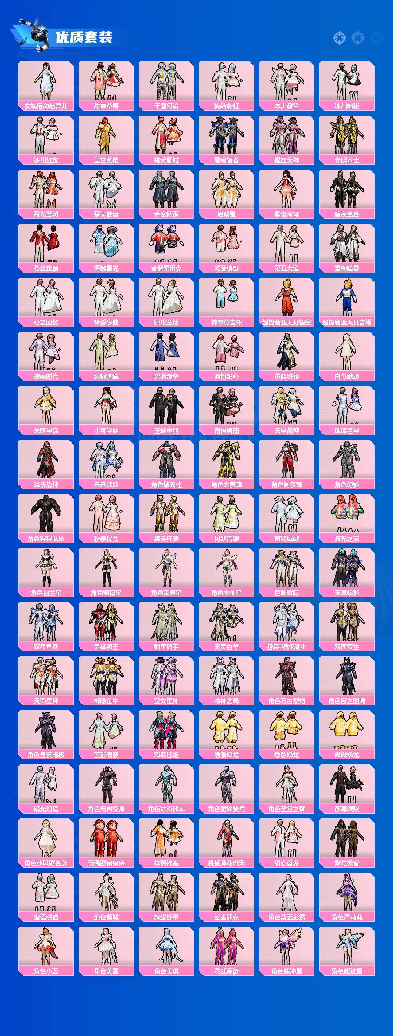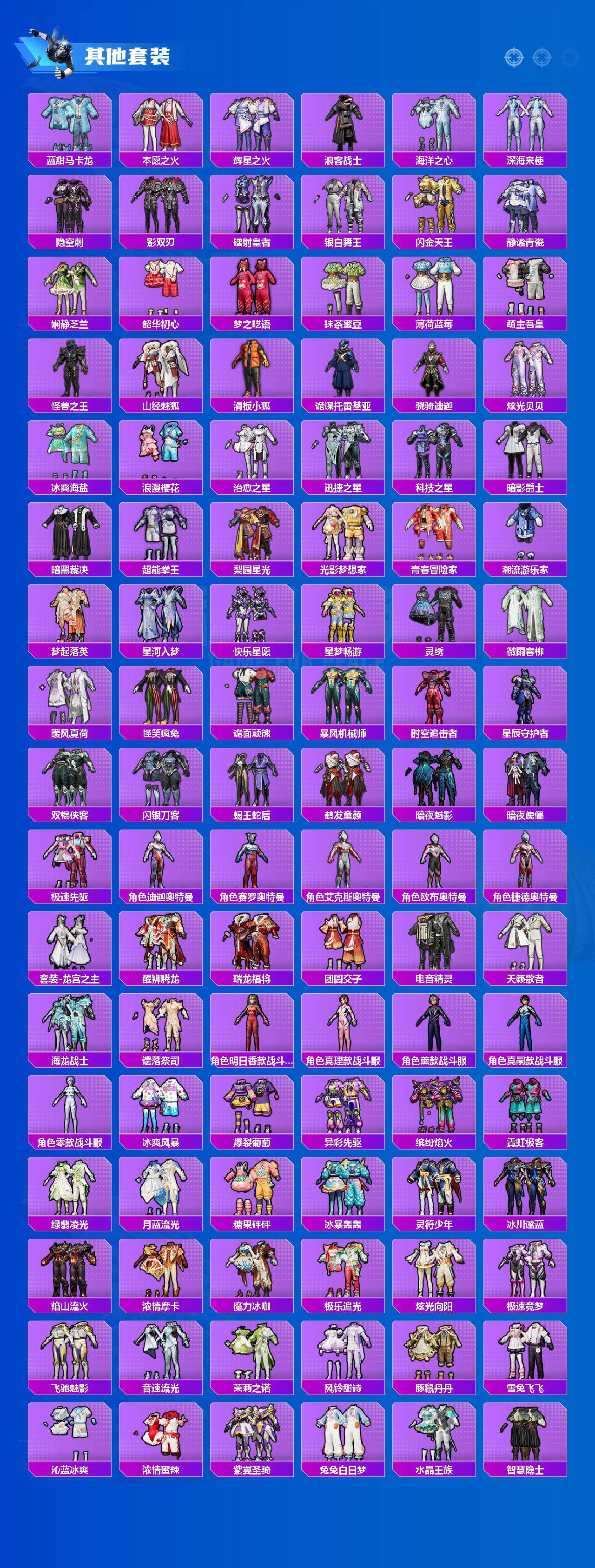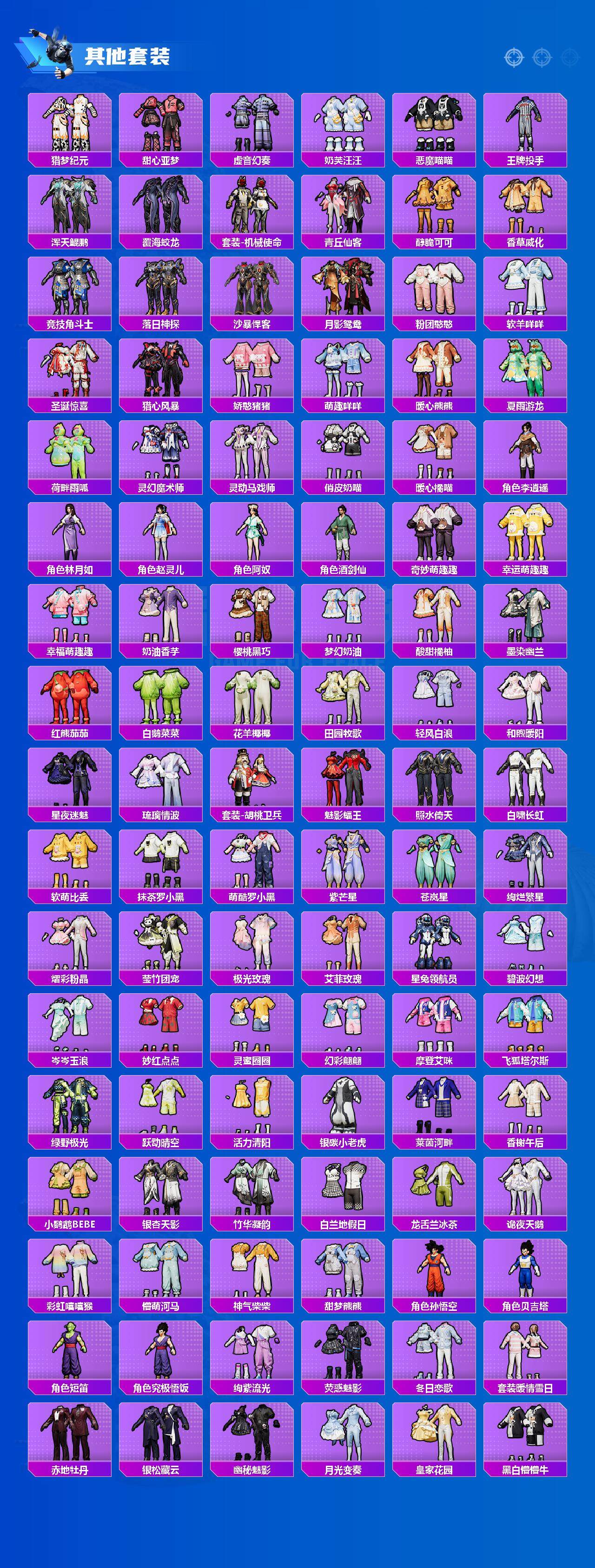 套装-浪漫天命,套装-金羽特工,套装-星河浪客,套装-六号树人,套装-暗影哥特,套装-粉红小猪,角色-8号机,角色-Mark.06,套装-星云玉兔,套装-KONE追光队服,套装-NV追光队服,套装-PAI追光队服,套装-RSG追光队服,套装-STE追光队服,套装-TC追光队服,套装-TEC追光队服,套装-TJB追光队服,套装-TT追光队服,套装-VS追光队服,套装-WBG追光队服
