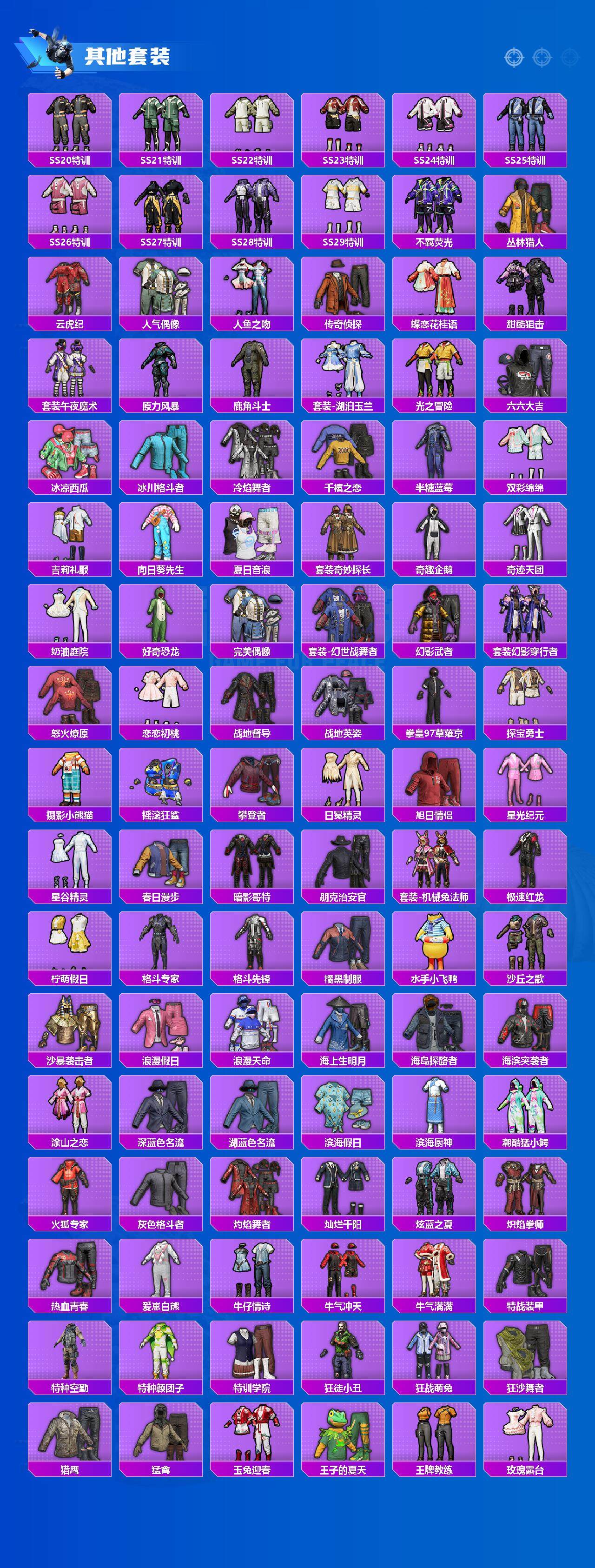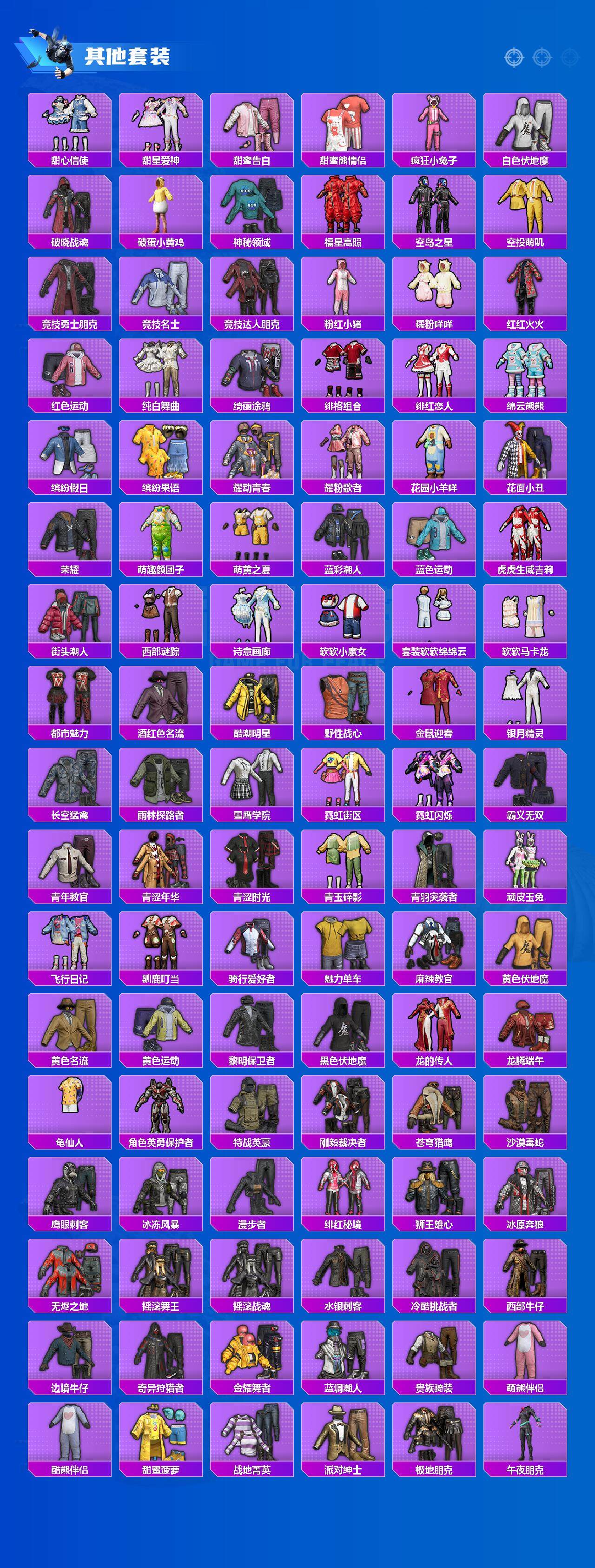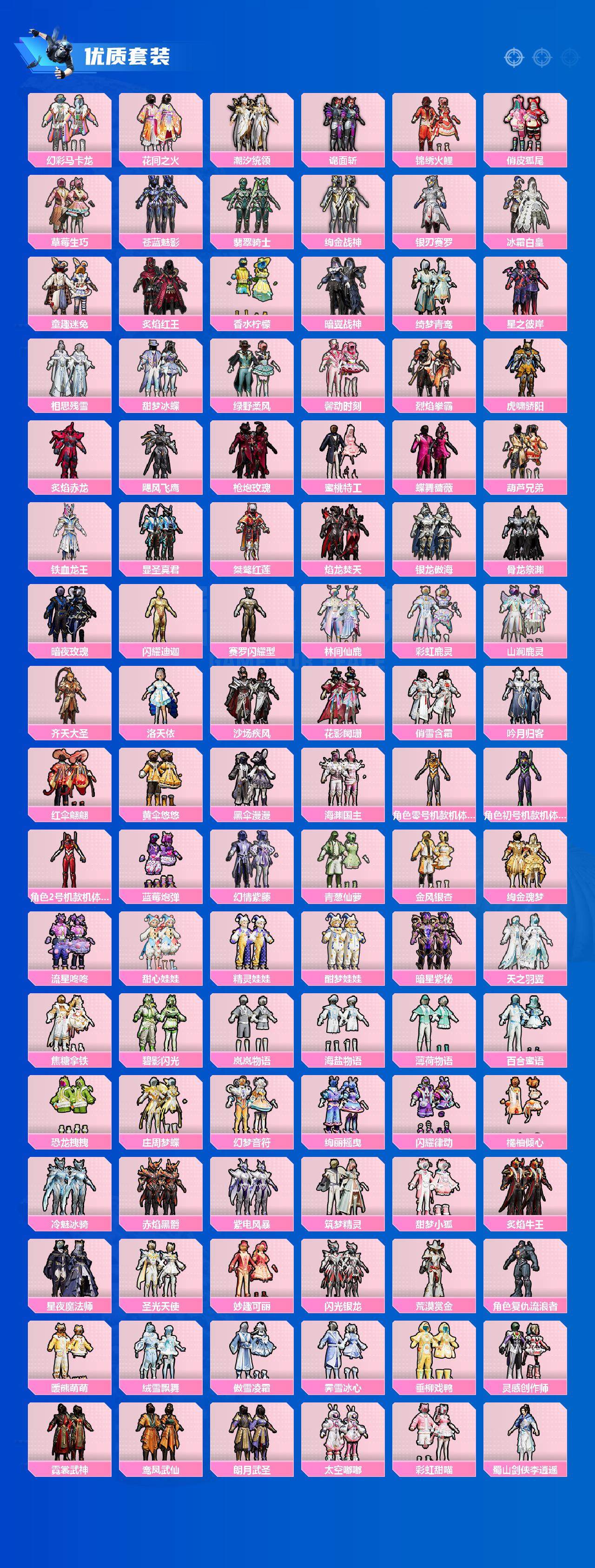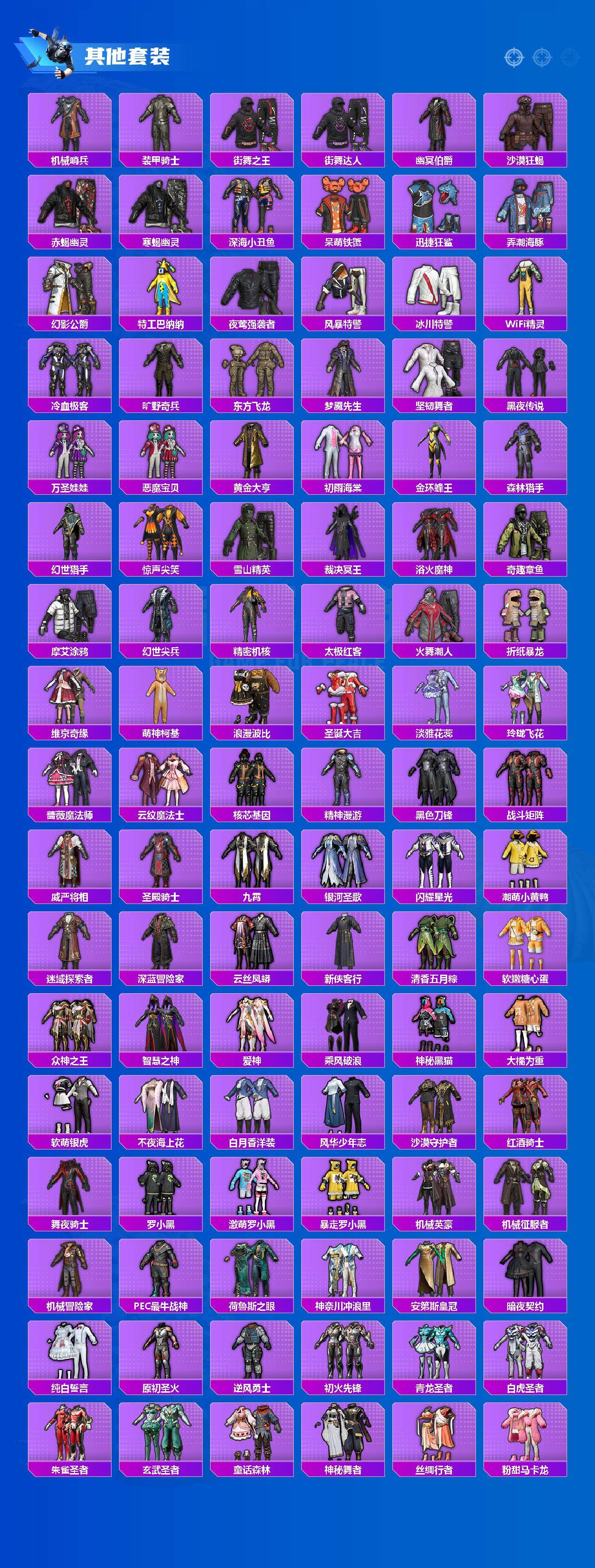 套装-浪漫天命,套装-金羽特工,套装-星河浪客,套装-六号树人,套装-暗影哥特,套装-粉红小猪,角色-8号机,角色-Mark.06,套装-星云玉兔,套装-KONE追光队服,套装-NV追光队服,套装-PAI追光队服,套装-RSG追光队服,套装-STE追光队服,套装-TC追光队服,套装-TEC追光队服,套装-TJB追光队服,套装-TT追光队服,套装-VS追光队服,套装-WBG追光队服