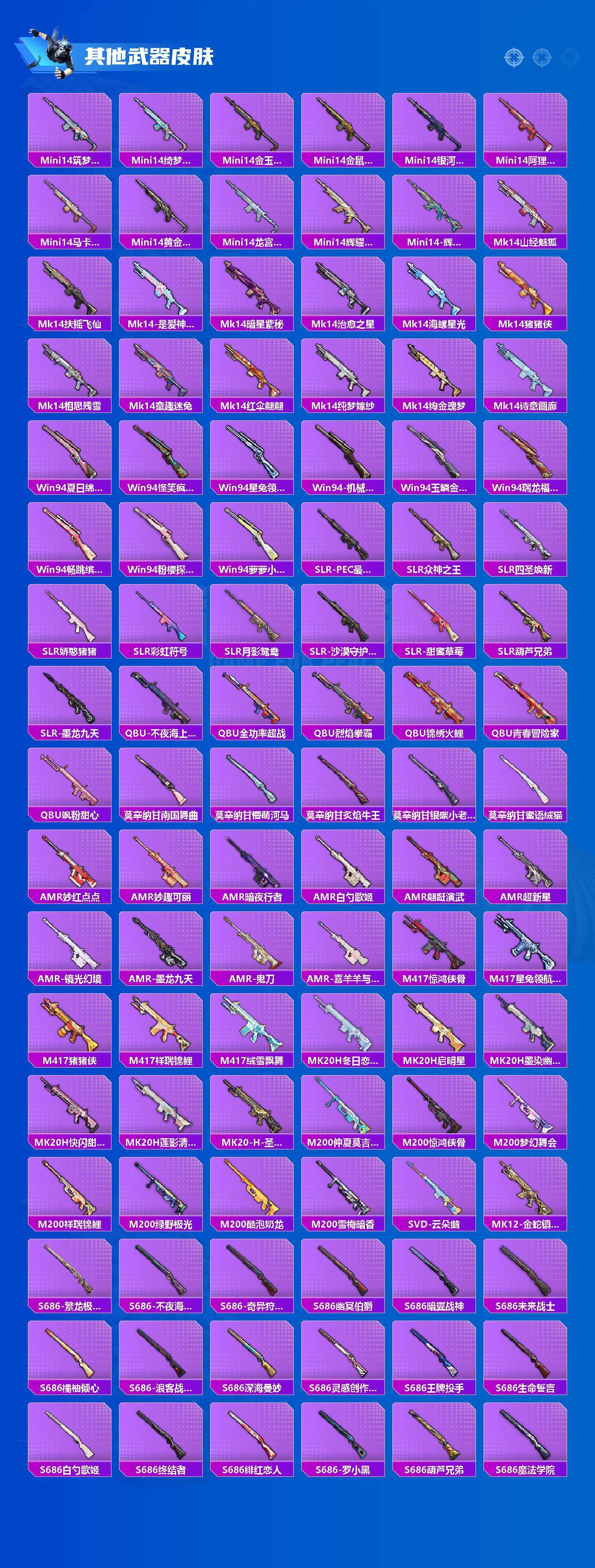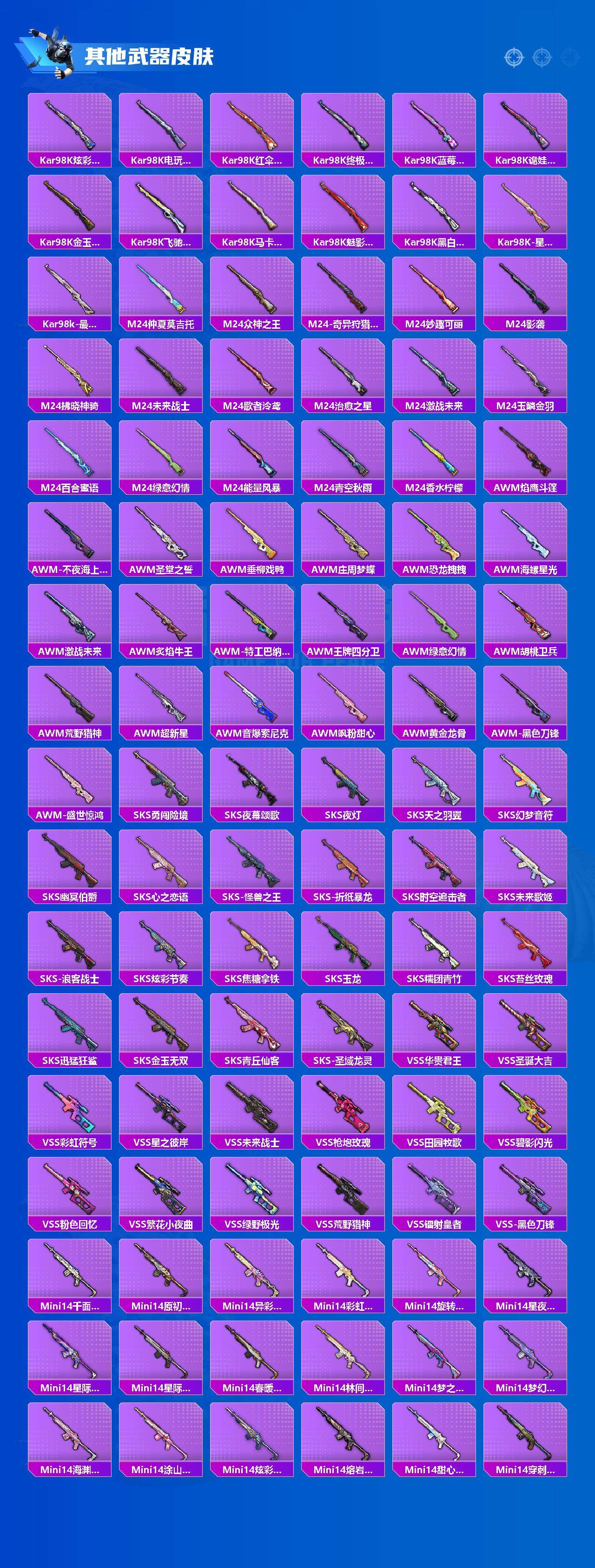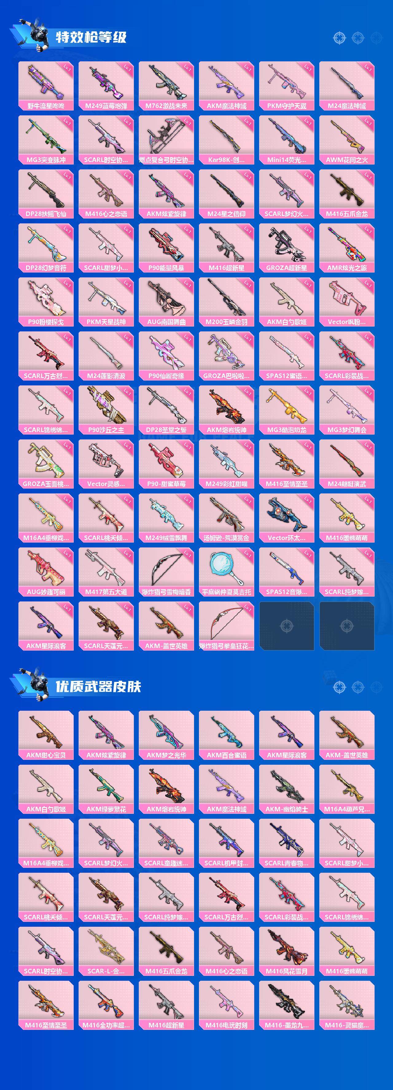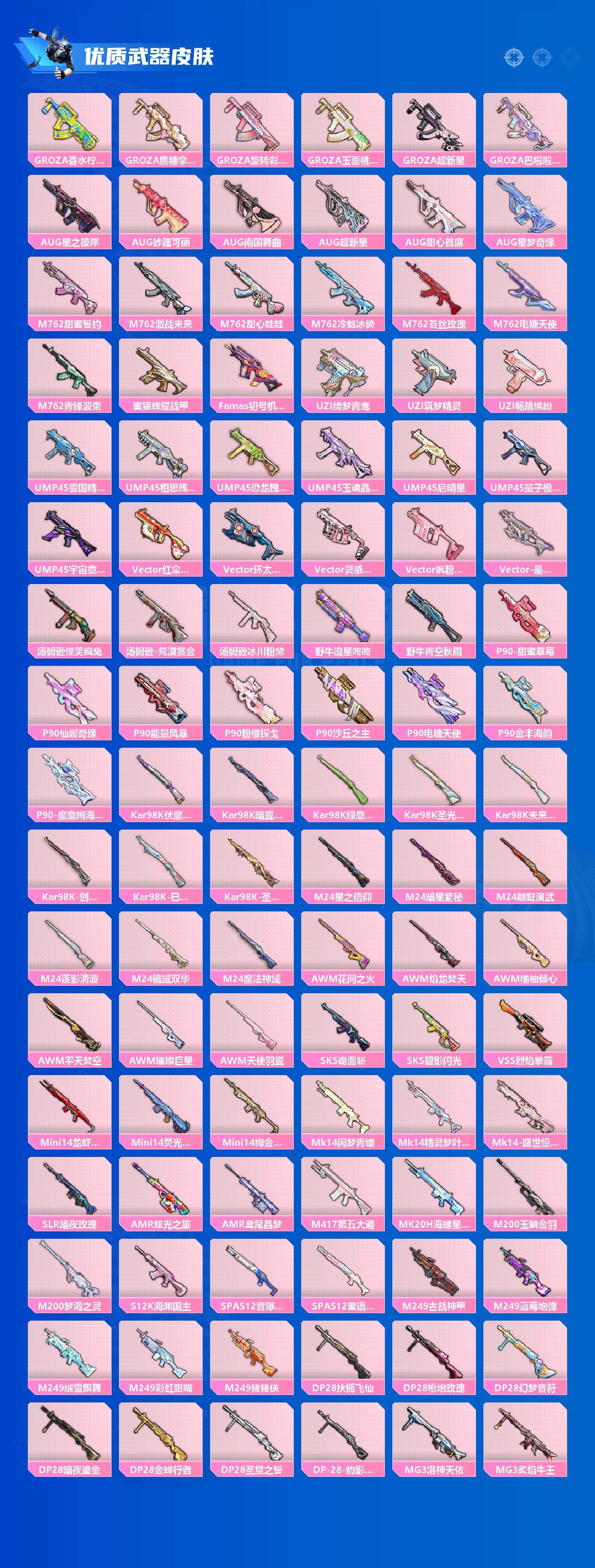 AKM-甜心宝贝,AKM-炫紫旋律,AKM-梦之光华,AKM-星际浪客,AKM-盖世英雄,AKM-白勺歌姬,AKM-绿萝繁花,AKM-熔岩统帅,AKM-魔法神域,AKM-幽焰骑士,M16A4-葫芦兄弟,M16A4-垂柳戏鸭,SCAR-L-梦幻火箭,SCAR-L-童趣迷兔,SCAR-L-机甲封神,SCAR-L-青春物语,SCAR-L-甜梦小狐,SCAR-L-桃夭倾城,SCAR-L-天蓬元帅,SCAR-L-纯梦嫁纱,SCAR-L-彩装战姬,SCAR-L-时空协奏,SCAR-L-金蛇镇世,M416-五爪金龙,M416-心之恋语,M416-风花雪月,M416-暖熊萌萌,M416-至情至圣,M416-全功率超战,M416-超新星,M416-电玩时刻,M416-墨龙九天,GROZA-香水柠檬,GROZA-焦糖拿铁,GROZA-旋转彩虹,GROZA-玉面桃花,GROZA-超新星,GROZA-巴啦啦小魔仙,AUG-星之彼岸,AUG-妙趣可丽,AUG-南国舞曲,AUG-超新星,AUG-甜心首席,AUG-星梦奇缘,M762-甜蜜誓约,M762-激战未来,M762-甜心娃娃,M762-冷魅冰骑,M762-苔丝玫瑰,M762-电糖天使,M762-青锋波束,蜜獾-辉耀战甲,Famas-觉醒初号机,UZI-绮梦青鸾,UZI-筑梦精灵,UZI-畅跳缤纷,UMP45-雪国精灵,UMP45-相思残雪,UMP45-恐龙拽拽,UMP45-玉魂晶魄,UMP45-量子极限,UMP45-宇宙意志,Vector-红伞翩翩,Vector-环太平洋,Vector-灵感创作师,Vector-飒粉甜心,汤姆逊-怪笑疯兔,汤姆逊-荒漠赏金,汤姆逊-冰川粉黛,野牛-流星咚咚,野牛-青空秋雨,P90-甜蜜草莓,P90-仙履奇缘,P90-能量风暴,P90-粉樱探戈,P90-沙丘之主,P90-电糖天使,P90-金丰海韵,Kar98K-伏魔团,Kar98K-暗翼战神,Kar98K-绿意幻情,Kar98K-圣光天使,Kar98K-未来歌姬,Kar98K-创世·救赎,Kar98K-巳巳如意,Kar98K-圣域龙灵,M24-星之信仰,M24-暗星紫秘,M24-翩跹演武,M24-莲影清波,M24-镜域双华,M24-魔法神域,AWM-花间之火,AWM-焰龙焚天,AWM-橘柚倾心,AWM-平天焚空,AWM-璀璨巨星,AWM-天使羽翼,SKS-诡面斩,SKS-碧影闪光,VSS-烈焰拳霸,Mini14-龙虾霸霸,Mini14-荧光虫舞,Mini14-绚金瑰梦,Mk14-闲梦青缨,Mk14-精灵梦叶罗丽,Mk14-盛世惊鸿,SLR-暗夜玫瑰,AMR-炫光之旅,AMR-鸢尾晶梦,M417-第五大道,MK20-H-海螺星光,M200-玉鳞金羽,M200-梦海之灵,S12K-海渊国主,SPAS-12-音爆索尼克,SPAS-12-蜜语绒猫,M249-古战神甲,M249-蓝莓炮弹,M249-绒雪飘舞,M249-彩虹甜喵,M249-猪猪侠,DP-28-扶摇飞仙,DP-28-幻梦音符,DP-28-暗夜鎏金,DP-28-金蝉行者,DP-28-圣堂之誓,MG3-洛神天依,MG3-炙焰牛王,MG3-梦幻舞会,MG3-酷泡奶龙,MG3-突变脉冲,PKM-天星战神,PKM-江南烟雨,PKM-守护天翼,爆炸猎弓-雪梅暗香,爆炸猎弓-拳皇·狂花道,平底锅-林间仙鹿,平底锅-仲夏莫吉托,烟雾弹-猫咪绅士,破片手榴弹-粉粉猫爪,破片手榴弹-秋玉花灯