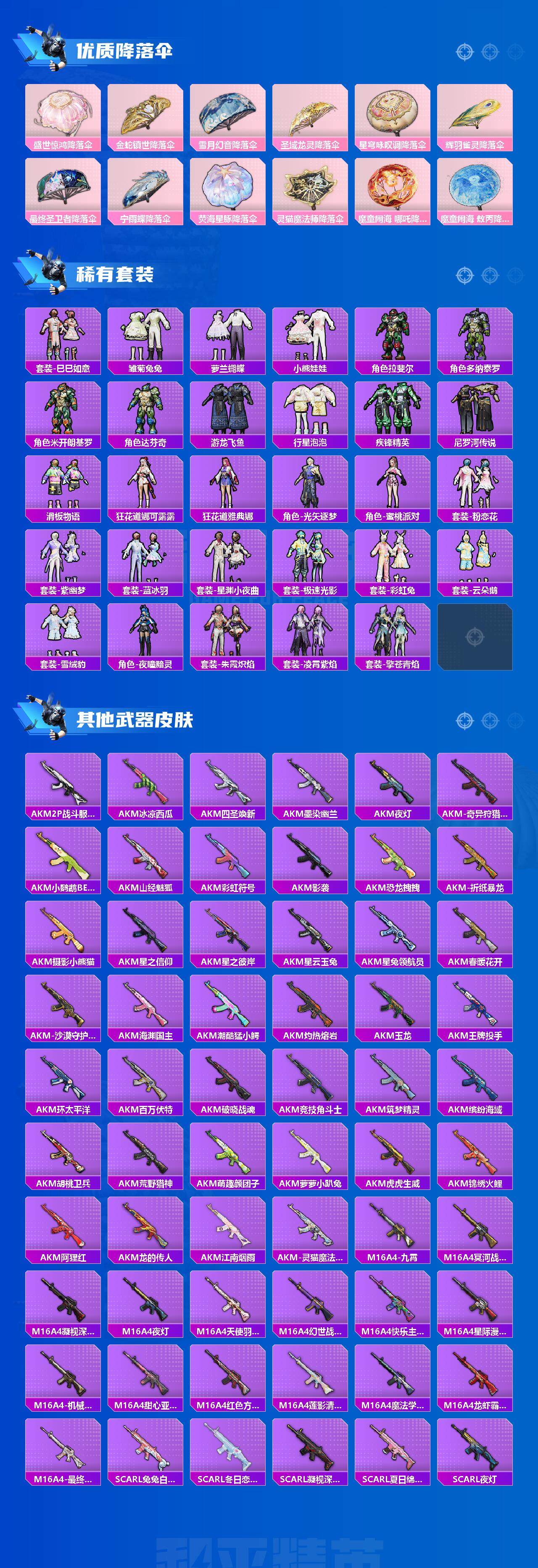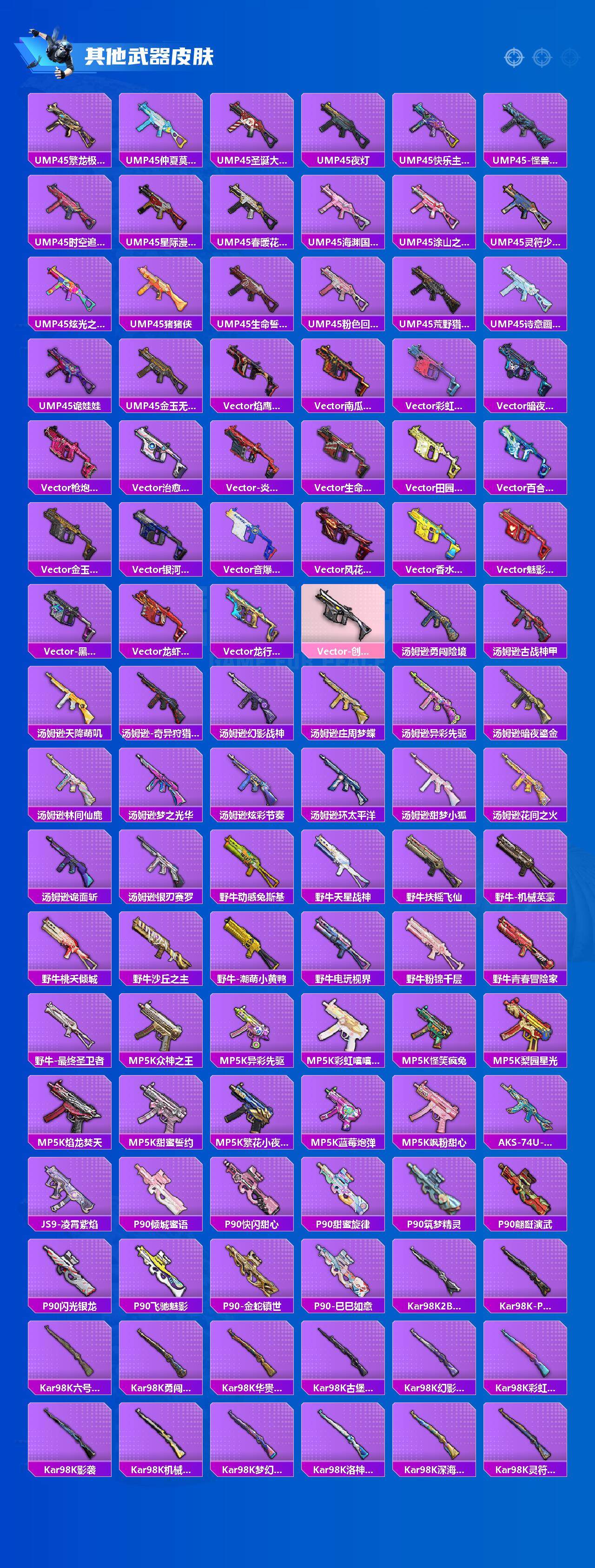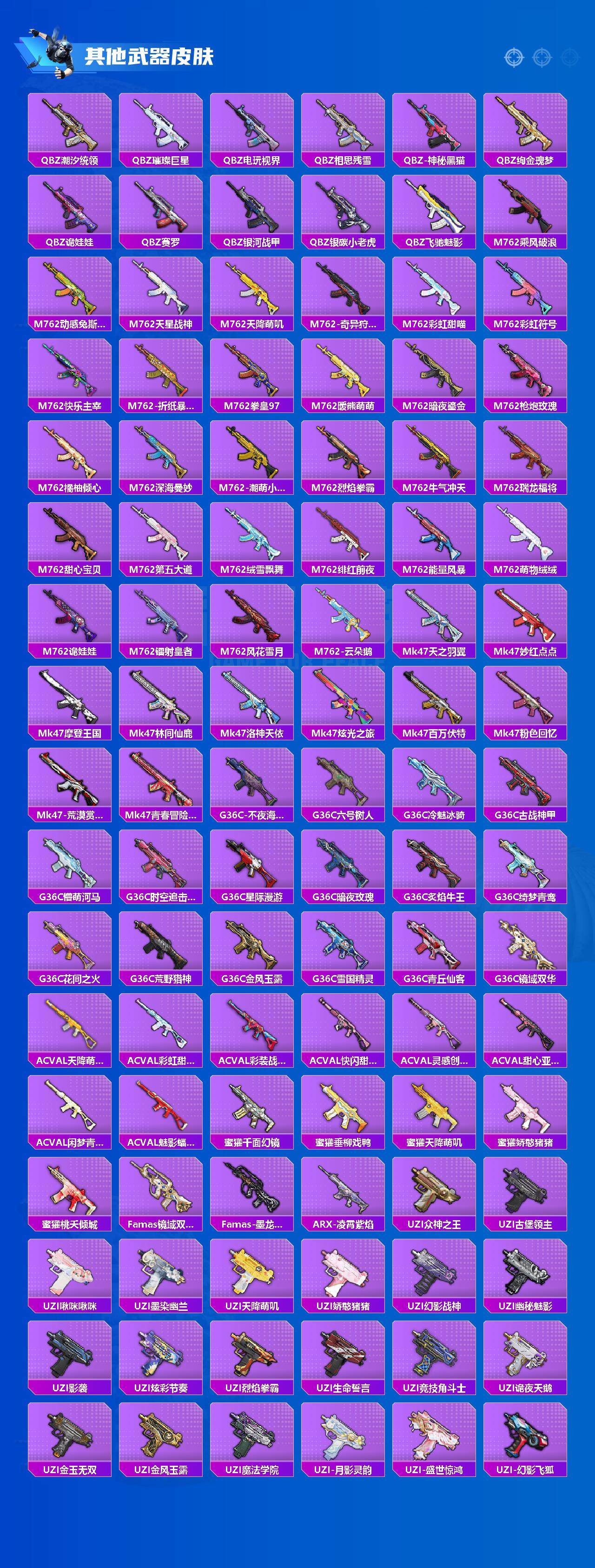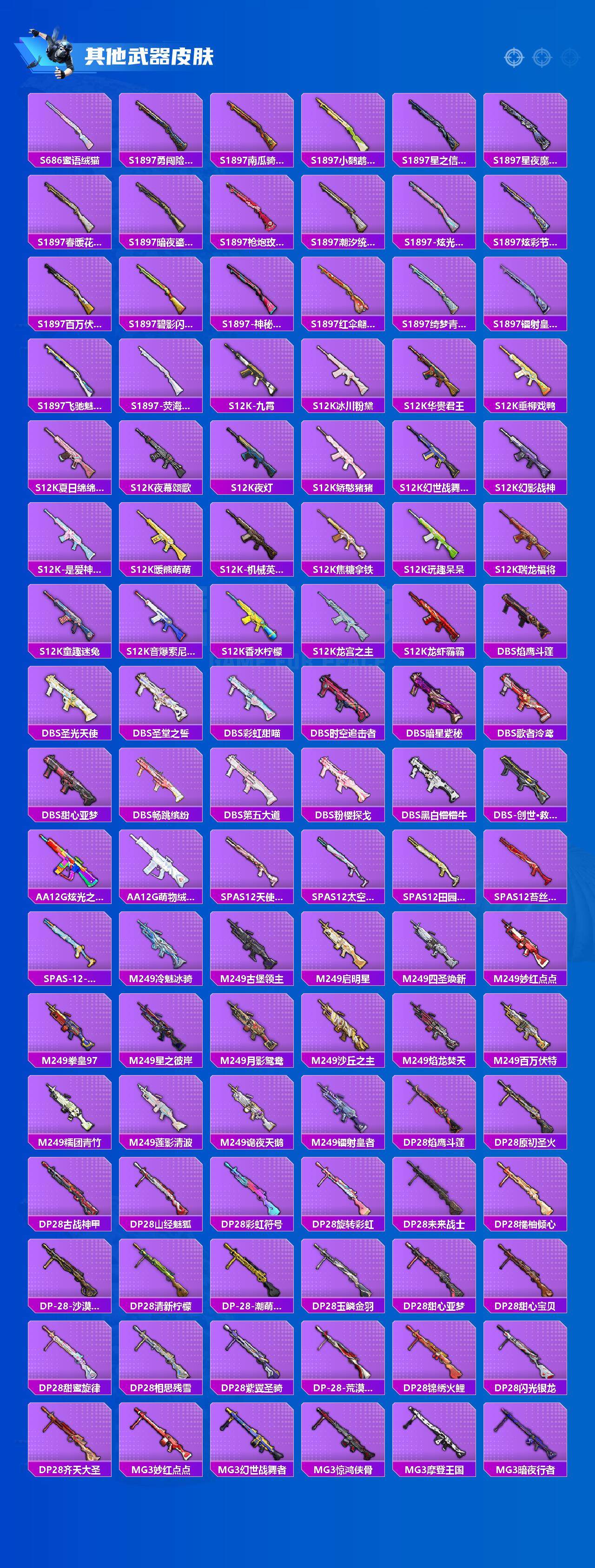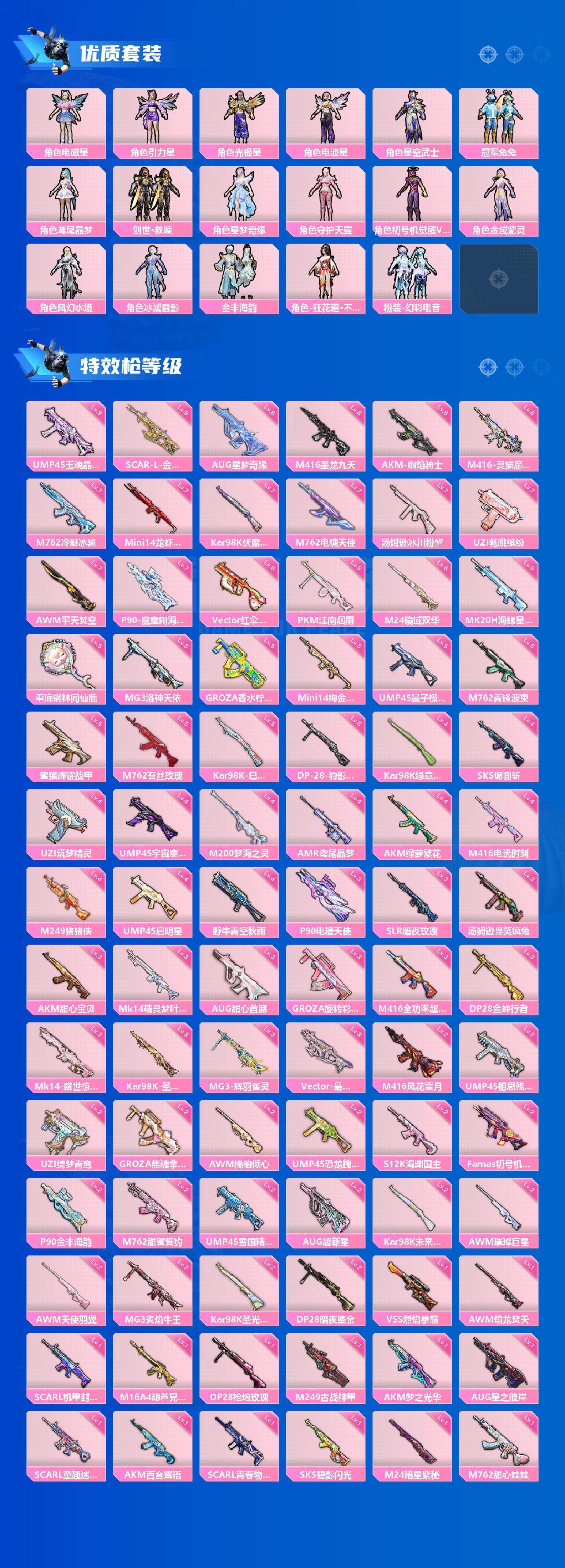 AKM-甜心宝贝,AKM-炫紫旋律,AKM-梦之光华,AKM-星际浪客,AKM-盖世英雄,AKM-白勺歌姬,AKM-绿萝繁花,AKM-熔岩统帅,AKM-魔法神域,AKM-幽焰骑士,M16A4-葫芦兄弟,M16A4-垂柳戏鸭,SCAR-L-梦幻火箭,SCAR-L-童趣迷兔,SCAR-L-机甲封神,SCAR-L-青春物语,SCAR-L-甜梦小狐,SCAR-L-桃夭倾城,SCAR-L-天蓬元帅,SCAR-L-纯梦嫁纱,SCAR-L-彩装战姬,SCAR-L-时空协奏,SCAR-L-金蛇镇世,M416-五爪金龙,M416-心之恋语,M416-风花雪月,M416-暖熊萌萌,M416-至情至圣,M416-全功率超战,M416-超新星,M416-电玩时刻,M416-墨龙九天,GROZA-香水柠檬,GROZA-焦糖拿铁,GROZA-旋转彩虹,GROZA-玉面桃花,GROZA-超新星,GROZA-巴啦啦小魔仙,AUG-星之彼岸,AUG-妙趣可丽,AUG-南国舞曲,AUG-超新星,AUG-甜心首席,AUG-星梦奇缘,M762-甜蜜誓约,M762-激战未来,M762-甜心娃娃,M762-冷魅冰骑,M762-苔丝玫瑰,M762-电糖天使,M762-青锋波束,蜜獾-辉耀战甲,Famas-觉醒初号机,UZI-绮梦青鸾,UZI-筑梦精灵,UZI-畅跳缤纷,UMP45-雪国精灵,UMP45-相思残雪,UMP45-恐龙拽拽,UMP45-玉魂晶魄,UMP45-量子极限,UMP45-宇宙意志,Vector-红伞翩翩,Vector-环太平洋,Vector-灵感创作师,Vector-飒粉甜心,汤姆逊-怪笑疯兔,汤姆逊-荒漠赏金,汤姆逊-冰川粉黛,野牛-流星咚咚,野牛-青空秋雨,P90-甜蜜草莓,P90-仙履奇缘,P90-能量风暴,P90-粉樱探戈,P90-沙丘之主,P90-电糖天使,P90-金丰海韵,Kar98K-伏魔团,Kar98K-暗翼战神,Kar98K-绿意幻情,Kar98K-圣光天使,Kar98K-未来歌姬,Kar98K-创世·救赎,Kar98K-巳巳如意,Kar98K-圣域龙灵,M24-星之信仰,M24-暗星紫秘,M24-翩跹演武,M24-莲影清波,M24-镜域双华,M24-魔法神域,AWM-花间之火,AWM-焰龙焚天,AWM-橘柚倾心,AWM-平天焚空,AWM-璀璨巨星,AWM-天使羽翼,SKS-诡面斩,SKS-碧影闪光,VSS-烈焰拳霸,Mini14-龙虾霸霸,Mini14-荧光虫舞,Mini14-绚金瑰梦,Mk14-闲梦青缨,Mk14-精灵梦叶罗丽,Mk14-盛世惊鸿,SLR-暗夜玫瑰,AMR-炫光之旅,AMR-鸢尾晶梦,M417-第五大道,MK20-H-海螺星光,M200-玉鳞金羽,M200-梦海之灵,S12K-海渊国主,SPAS-12-音爆索尼克,SPAS-12-蜜语绒猫,M249-古战神甲,M249-蓝莓炮弹,M249-绒雪飘舞,M249-彩虹甜喵,M249-猪猪侠,DP-28-扶摇飞仙,DP-28-幻梦音符,DP-28-暗夜鎏金,DP-28-金蝉行者,DP-28-圣堂之誓,MG3-洛神天依,MG3-炙焰牛王,MG3-梦幻舞会,MG3-酷泡奶龙,MG3-突变脉冲,PKM-天星战神,PKM-江南烟雨,PKM-守护天翼,爆炸猎弓-雪梅暗香,爆炸猎弓-拳皇·狂花道,平底锅-林间仙鹿,平底锅-仲夏莫吉托,烟雾弹-猫咪绅士,破片手榴弹-粉粉猫爪,破片手榴弹-秋玉花灯
