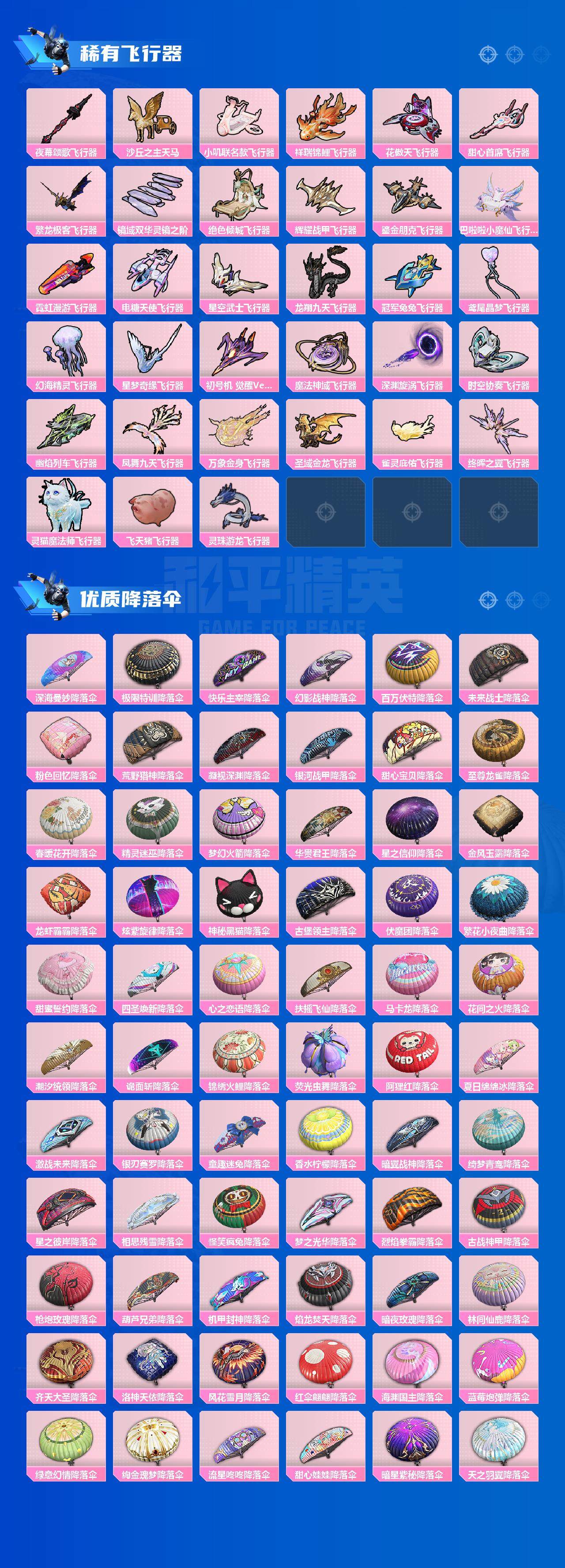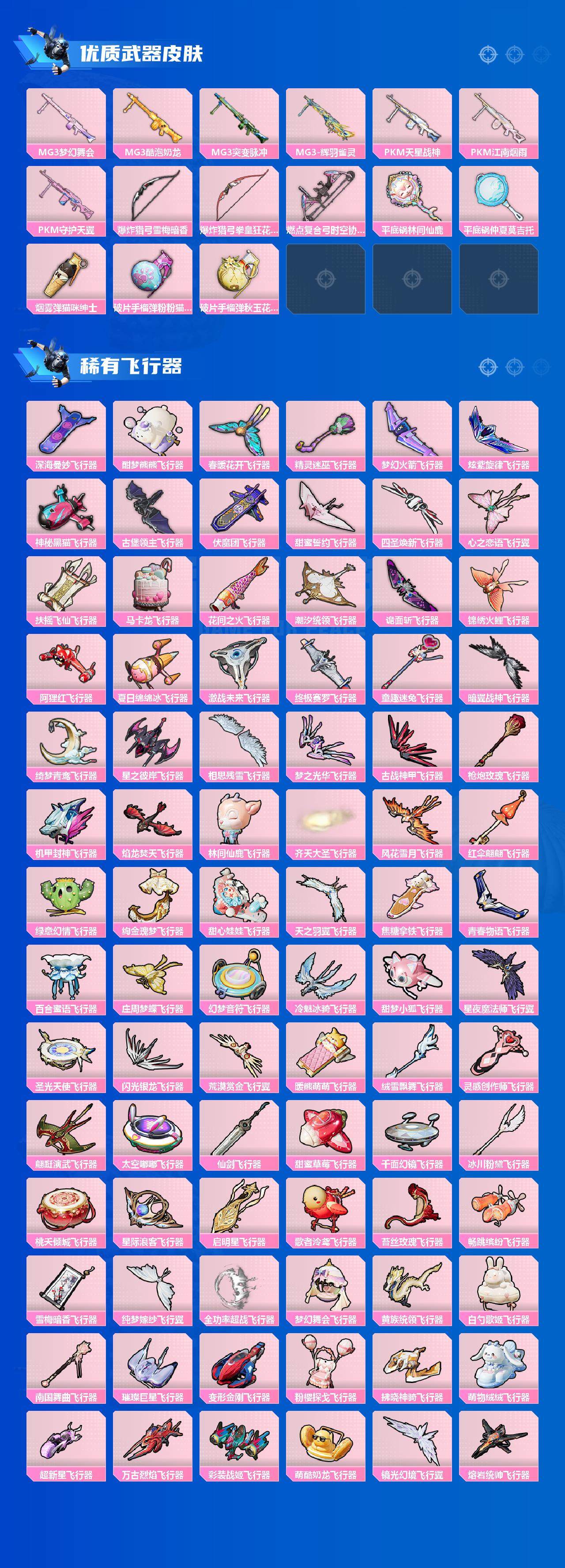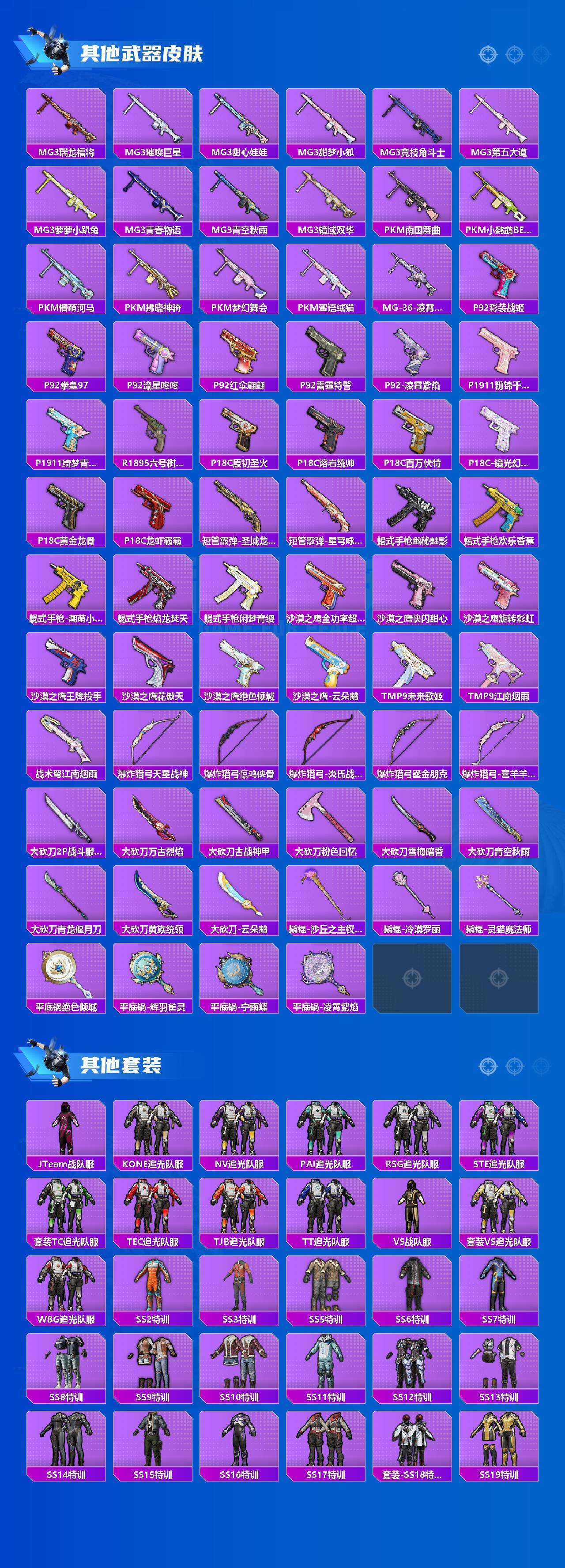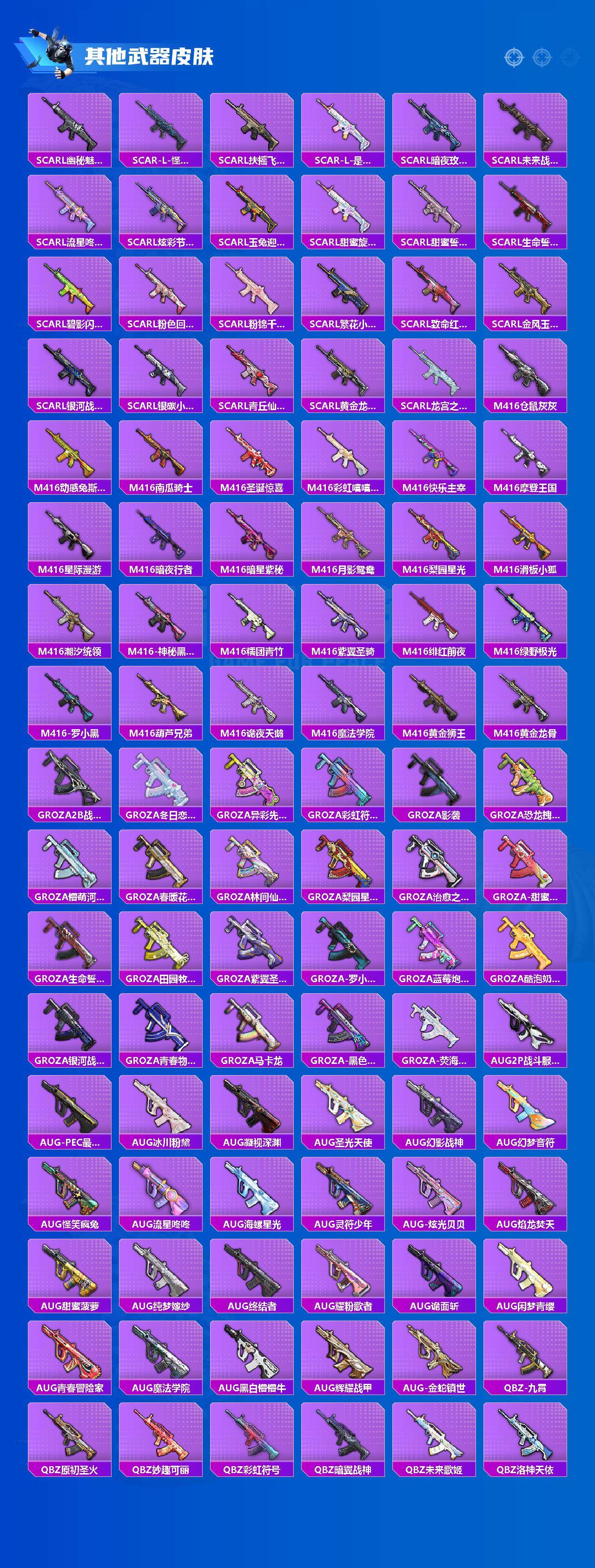 AKM-甜心宝贝,AKM-炫紫旋律,AKM-梦之光华,AKM-星际浪客,AKM-盖世英雄,AKM-白勺歌姬,AKM-绿萝繁花,AKM-熔岩统帅,AKM-魔法神域,AKM-幽焰骑士,M16A4-葫芦兄弟,M16A4-垂柳戏鸭,SCAR-L-梦幻火箭,SCAR-L-童趣迷兔,SCAR-L-机甲封神,SCAR-L-青春物语,SCAR-L-甜梦小狐,SCAR-L-桃夭倾城,SCAR-L-天蓬元帅,SCAR-L-纯梦嫁纱,SCAR-L-彩装战姬,SCAR-L-时空协奏,SCAR-L-金蛇镇世,M416-五爪金龙,M416-心之恋语,M416-风花雪月,M416-暖熊萌萌,M416-至情至圣,M416-全功率超战,M416-超新星,M416-电玩时刻,M416-墨龙九天,GROZA-香水柠檬,GROZA-焦糖拿铁,GROZA-旋转彩虹,GROZA-玉面桃花,GROZA-超新星,GROZA-巴啦啦小魔仙,AUG-星之彼岸,AUG-妙趣可丽,AUG-南国舞曲,AUG-超新星,AUG-甜心首席,AUG-星梦奇缘,M762-甜蜜誓约,M762-激战未来,M762-甜心娃娃,M762-冷魅冰骑,M762-苔丝玫瑰,M762-电糖天使,M762-青锋波束,蜜獾-辉耀战甲,Famas-觉醒初号机,UZI-绮梦青鸾,UZI-筑梦精灵,UZI-畅跳缤纷,UMP45-雪国精灵,UMP45-相思残雪,UMP45-恐龙拽拽,UMP45-玉魂晶魄,UMP45-量子极限,UMP45-宇宙意志,Vector-红伞翩翩,Vector-环太平洋,Vector-灵感创作师,Vector-飒粉甜心,汤姆逊-怪笑疯兔,汤姆逊-荒漠赏金,汤姆逊-冰川粉黛,野牛-流星咚咚,野牛-青空秋雨,P90-甜蜜草莓,P90-仙履奇缘,P90-能量风暴,P90-粉樱探戈,P90-沙丘之主,P90-电糖天使,P90-金丰海韵,Kar98K-伏魔团,Kar98K-暗翼战神,Kar98K-绿意幻情,Kar98K-圣光天使,Kar98K-未来歌姬,Kar98K-创世·救赎,Kar98K-巳巳如意,Kar98K-圣域龙灵,M24-星之信仰,M24-暗星紫秘,M24-翩跹演武,M24-莲影清波,M24-镜域双华,M24-魔法神域,AWM-花间之火,AWM-焰龙焚天,AWM-橘柚倾心,AWM-平天焚空,AWM-璀璨巨星,AWM-天使羽翼,SKS-诡面斩,SKS-碧影闪光,VSS-烈焰拳霸,Mini14-龙虾霸霸,Mini14-荧光虫舞,Mini14-绚金瑰梦,Mk14-闲梦青缨,Mk14-精灵梦叶罗丽,Mk14-盛世惊鸿,SLR-暗夜玫瑰,AMR-炫光之旅,AMR-鸢尾晶梦,M417-第五大道,MK20-H-海螺星光,M200-玉鳞金羽,M200-梦海之灵,S12K-海渊国主,SPAS-12-音爆索尼克,SPAS-12-蜜语绒猫,M249-古战神甲,M249-蓝莓炮弹,M249-绒雪飘舞,M249-彩虹甜喵,M249-猪猪侠,DP-28-扶摇飞仙,DP-28-幻梦音符,DP-28-暗夜鎏金,DP-28-金蝉行者,DP-28-圣堂之誓,MG3-洛神天依,MG3-炙焰牛王,MG3-梦幻舞会,MG3-酷泡奶龙,MG3-突变脉冲,PKM-天星战神,PKM-江南烟雨,PKM-守护天翼,爆炸猎弓-雪梅暗香,爆炸猎弓-拳皇·狂花道,平底锅-林间仙鹿,平底锅-仲夏莫吉托,烟雾弹-猫咪绅士,破片手榴弹-粉粉猫爪,破片手榴弹-秋玉花灯