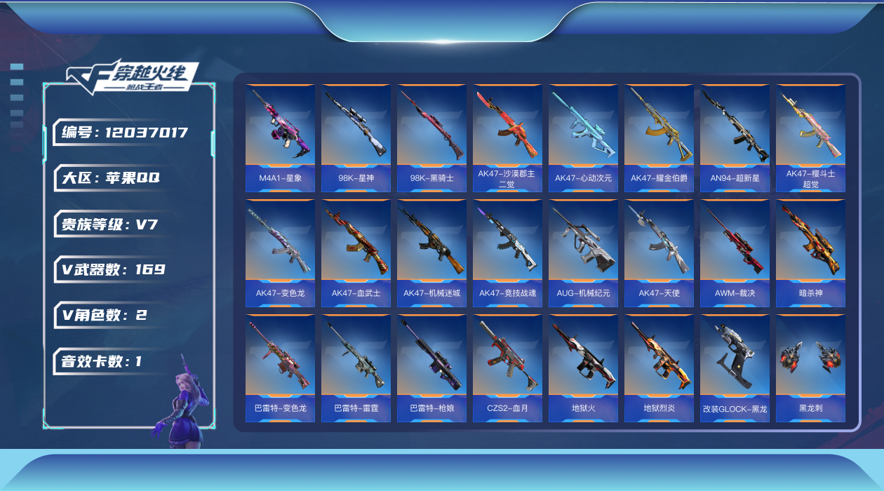 [12037017]暑期末清货/特价急出/永久包赔/商品详情看图苹果 有二次【贵族7级 169V!7王者星象m4 超值特惠号】 【王者系列】 王者之影 王者之魄 王者之心 王者之魂 【热门武器】 M4A1-星象 M4A1-游骑兵 81式-阿波罗 COP 357-A COP 357-A 【v武器】 09式狙-魔音长歌 98K-星神 98K-黑骑士 AK47-沙漠郡主-二觉 AK47-心动次元 AK47-冰魂 AK47-耀金伯爵 AN94-超新星 AK47-樱斗士-超觉 AK47-变色龙 AK47-血武士 AK47-机械迷城 AK47-竞技战魂 AUG-机械纪元 AK47-天使 AWM-裁决 暗杀神 巴雷特-变色龙 巴雷特-雷霆 巴雷特-枪娘 CZS2-血月 地狱火 地狱火 地狱烈炎 改装GLOCK-黑龙 黑龙刺 寒霜烈龙 加特林-堡垒 加特林-堡垒 激光短刃-黑骑士 剑齿虎-炫彩 KSG-火力竞放 刘易斯-血月 M200-心动次元 M14EBR-暗夜 M4A1-卧龙 M4A1-樱龙·二觉 墨刃-幻神 M4A1-猎神 蟒蛇-火力竞放 M4A1-星象 M4A1-黑龙 M4A1-游骑兵 M4A1-海骑士 M4A1-龙血 MK5-极光 M12S-雷霆 MG3-雏凤 尼泊尔-机械纪元 PP19野牛-造纸术觉醒 麒麟刺 QBZ03-金色蔷薇 擎天觉醒 秋逸觉醒 QSZ92-华夏传说 QBB95-极光 QCW05-变形金刚·大黄蜂 QCW05-变形金刚·大黄蜂 QBZ19-天使 QSZ92-天使 神罚战斧 SCAR-幽暗骑士 沙鹰-飞电 双持尼泊尔-变色龙 双截棍-天使 SCAR-探星者 SCAR-印刷术 SCAR-印刷术 嗜血金鲨 双持斯泰尔-天使 双管猎枪-黑骑士 双持沙鹰-变色龙 铁锹-孟德 汤姆逊-烈龙 USP-神罚 星芒 血阳 消音沙鹰-牛魔王 斩魔剑-天使 左轮-黑武士觉醒 战斧-无影 斩神刀 【其他武器】 寒霜烈龙 玫瑰精灵 【角色】 葵 审判者 【万化皮肤】 【音效卡】 【C4皮肤+拆弹动画】 ,AK47-无影-电音