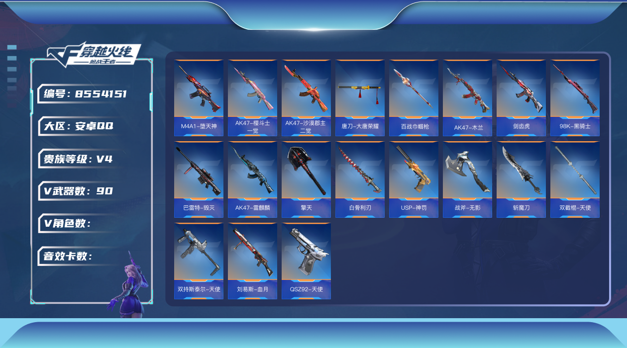 [8554151]安卓q区 毁灭套 无影套 103级 V4 90v 元首 加特林-炼狱-现代战场音效卡 唐刀-大唐荣耀,双截棍-天使,斩魔刀,剑齿虎,QSZ92-天使,双持斯泰尔-天使,擎天,百战巾帼枪,AK47-木兰,战斧-无影,AK47-樱斗士-一觉,98K-黑骑士,AK47-雷麒麟,巴雷特-毁灭,USP-神罚,刘易斯-血月,AK47-沙漠郡主-二觉,白骨利刃,M4A1-堕天神,屠龙,加特林-蟒蛇,巴雷特-极光,尼泊尔-机械纪元,M4A1-运输船,尼泊尔-火麒麟,AK47-无影,M4A1-雷神,QBZ03-金色蔷薇,AUG-机械纪元,M4A1-死神,加特林-堡垒,沙鹰-无影,AWM-天使,沙鹰-火麒麟,09式狙-天神,SCAR-探星者,血月,寒霜烈龙,沙鹰-修罗,马来剑-毁灭,AK47-变色龙,神罚战斧,AK47-血武士,M4A1-沙漠领主,血阳,AK47-天使,M4A1-海骑士,龙啸,AK47-黑鲨,9A91-天神,QBZ03-死神 人物角色:瞳