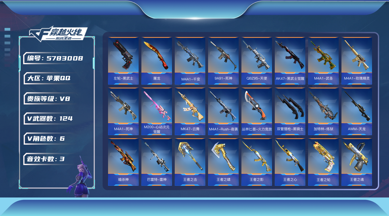 [5783008]穿越火线-枪战王者(CFM)-苹果QQ 等级152 V8 收藏点数12918 王者武器11 英雄武器124 武器皮肤46 英雄角色6 ,其他详情看图. 【系统】苹果QQ 【游戏等级】152 【贵族等级】V8 【收藏点数】12918 【武器】王者之心 王者之影 王者之翼-冰霜奇迹 王者之魂 王者之轮 王者之啸 王者之锋-冰霜奇迹 王者之击 王者之翼手雷 王者之圣闪光弹-冰霜奇迹 王者之圣烟雾弹-冰霜奇迹 M4A1-武圣 巴雷特-雷神 81式-光明之神-千变 MK47-云舞 双管猎枪-黑骑士 M4A1-雷神-千变 M4A1-死神*2 巴雷特-极光-能量核心 加特林-炼狱 沙鹰-修罗-诸神黄昏 左轮-黑武士 左轮-黑武士觉醒-能量核心 屠龙*2 屠龙-魔神 丛林匕首-火力竞放 AK47-无影-不屈老兵 AK47-无影-荣耀酷本 AK47-火麒麟-钰 AK47-黑武士觉醒 M4A1-黑骑士-电竞之皇 M4A1-黑龙-能量核心 M4A1-玫瑰精灵 M4A1-樱龙·超觉 M4A1-Rush-夜袭 M4A1-千变 QBZ95-天使 9A91-死神 AWM-天龙 巴雷特-毁灭-寒霜 暗杀神 M200-心动次元觉醒 MG3-雏凤*3 加特林-堡垒*5 MK5-机械纪元*3 MK5-机械纪元-蚀刻战甲 MK5-极光 双持斯泰尔-天使-血翼 斯泰尔-恶魔 地狱火*2 嗜血金鲨*2 地狱烈炎 地狱烈樱·二觉 KSG-火力竞放 USP-神罚*5 沙鹰-修罗-能量核心*2 沙鹰-修罗 沙鹰-修罗-不屈老兵 沙鹰-飞电 沙鹰-火麒麟 沙鹰-天神*3 沙鹰-无影*2 双持沙鹰-亚龙 左轮-黑武士觉醒-Continue 蟒蛇-火力竞放 改装GLOCK-木兰 激光短刃-黑骑士 墨刃-幻神 龙啸-千变 龙啸 神罚战斧 战斧-无影 血阳*3 尼泊尔-火麒麟 血月*4 双持尼泊尔-亚龙 麒麟刺*2 星芒*4 耀金雷刃 马来剑-毁灭*2 斩魔剑-天使 百战巾帼枪 擎天觉醒-Continue 铁锹-游骑兵 斩神刀 黑武士手雷*2 黑武士闪光弹-Continue 黑武士烟雾弹 死神手雷*3 死神闪光弹*3 死神烟雾弹*3 火麒麟手雷*2 燃烧弹-游骑兵-紫魇 火麒麟闪光弹【角色】香香 樱 萝拉 职场灵狐-赛事经理 孤狼 葵 【音效卡】加特林-炼狱-现代战场 巴雷特-毁灭-现代战场*2