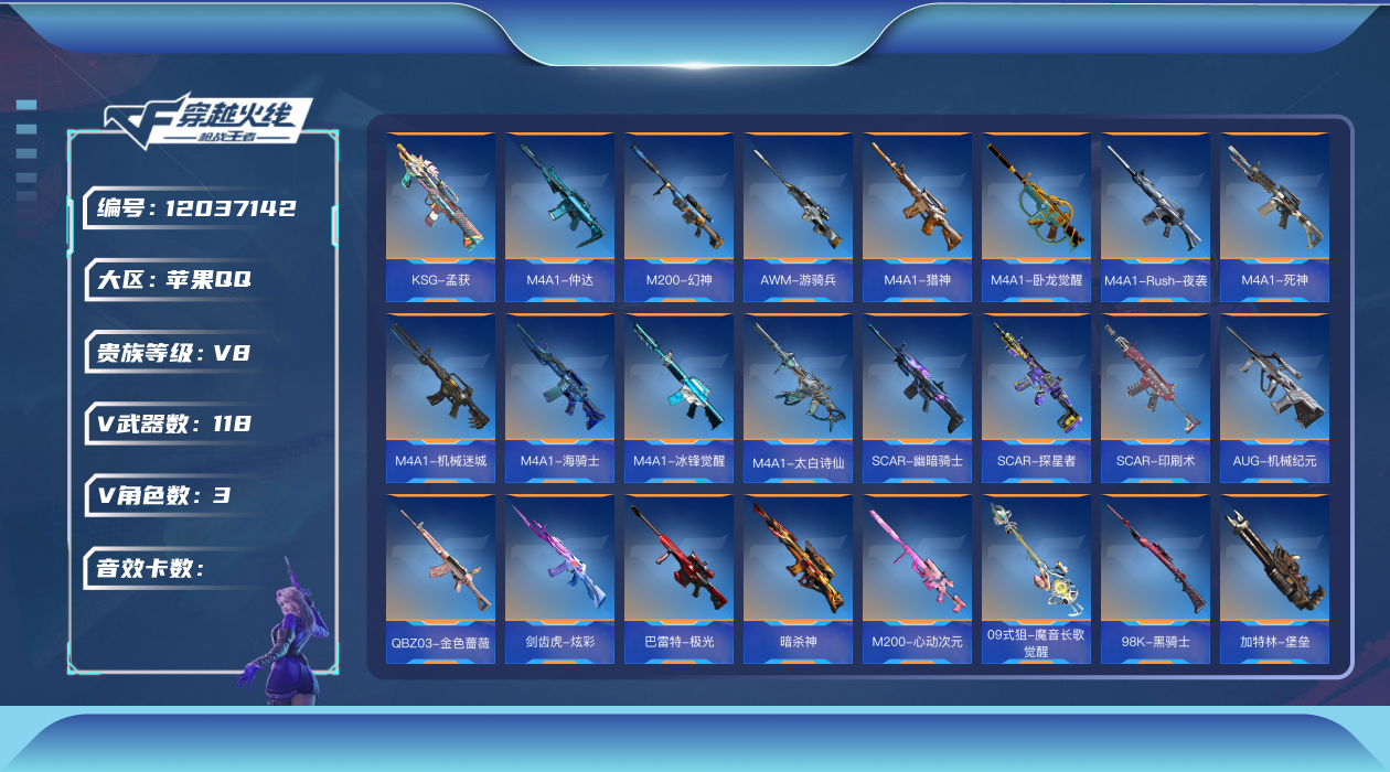 [12037142]暑期末清货/特价急出/永久包赔/商品详情看图 有二次/VIP8级/多王者套/多三国武器【商品标题】:3英雄角色数-115英雄武器数 【王者系列】:王者之影,王者之心,王者之锋 【热门武器】:KSG-孟获,M4A1-仲达,M200-幻神,AWM-游骑兵 【英雄武器】:M4A1-仲达,M4A1-猎神,M4A1-卧龙觉醒,M4A1-Rush-夜袭,M4A1-死神,M4A1-机械迷城,M4A1-海骑士,M4A1-冰锋觉醒,M4A1-太白诗仙,SCAR-幽暗骑士,SCAR-幽暗骑士,SCAR-探星者,SCAR-印刷术,AUG-机械纪元,QBZ03-金色蔷薇,剑齿虎-炫彩,AWM-游骑兵,巴雷特-极光,暗杀神,M200-心动次元,M200-幻神,09式狙-魔音长歌觉醒,98K-黑骑士,加特林-堡垒,QBB95-极光,MK5-极光,寒霜烈龙,双持斯泰尔-天使,双持斯泰尔-天使,CBJ-MS-毒蜂,地狱烈炎,KSG-火力竞放,KSG-孟获,沙鹰-冰锋觉醒,沙鹰-修罗,沙鹰-幻兽,沙鹰-无影,QSZ92-华夏传说,CZ75-穷奇,气手枪-血月,丛林匕首-火力竞放,雌雄双股剑,麒麟刺,擎天觉醒,秋逸,星芒,星芒,血阳,血月 【其他武器】:玫瑰精灵,寒霜烈龙 【角色】:审判者,樱,关小雨