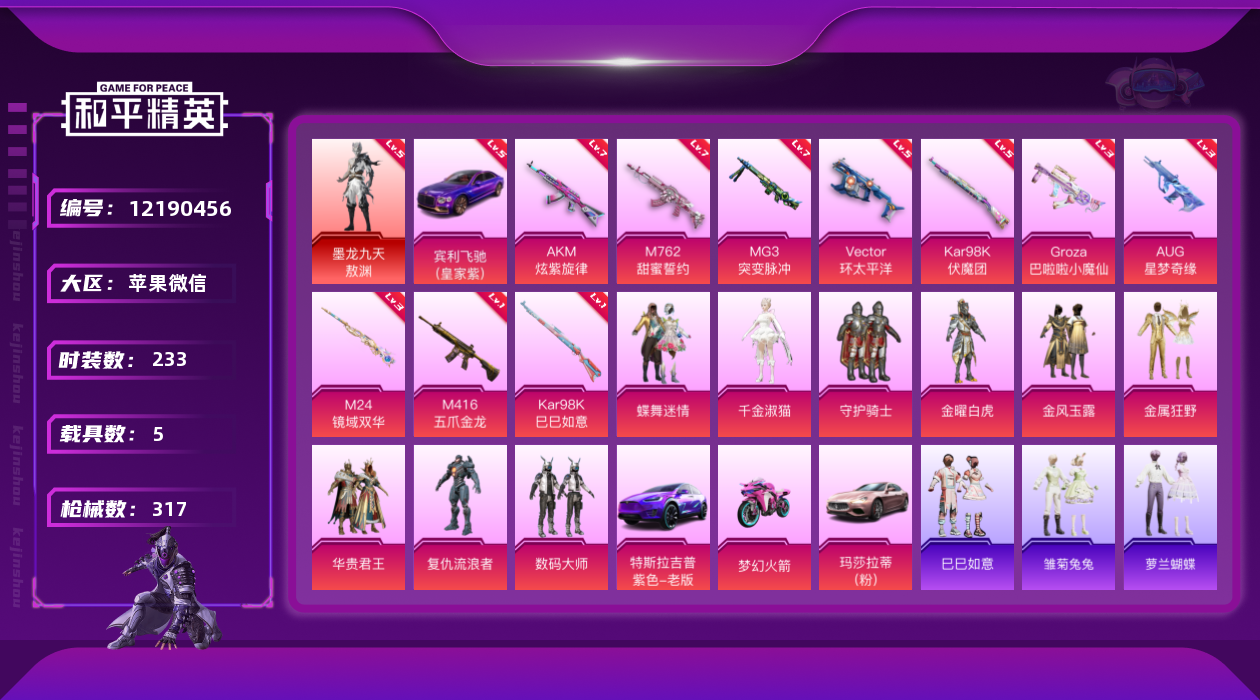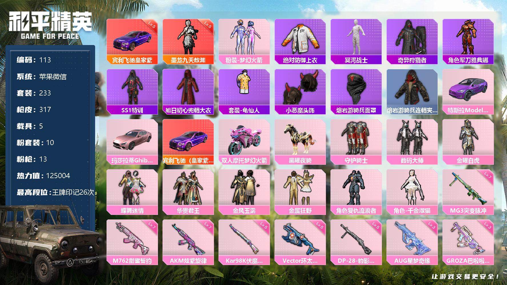 [12190456]【商品标题】:苹果 3级星梦5级敖渊新101木乃伊巡查衣5级宾利3把7级枪! 微信-1神装-10粉装-13特效枪-5载具-7粉色飞行器-125004热力值-26王牌印记-233套装-317枪皮