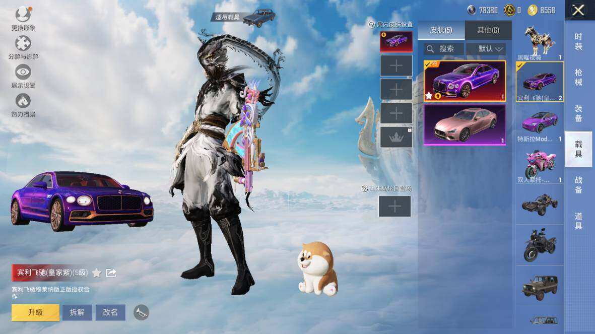 【粉色载具】:特斯拉Model X(奇幻紫),玛莎拉蒂Ghibli(粉),宾利飞驰(皇家紫),双人摩托-梦幻火箭,黑曜夜骑