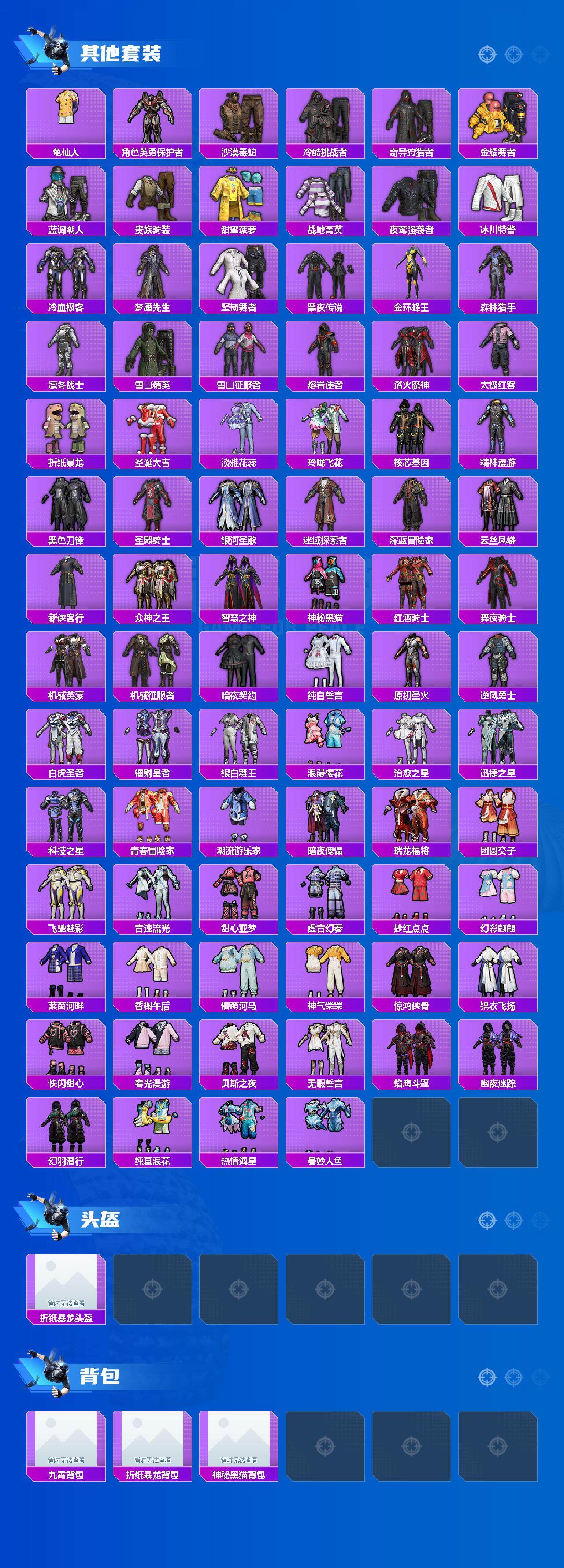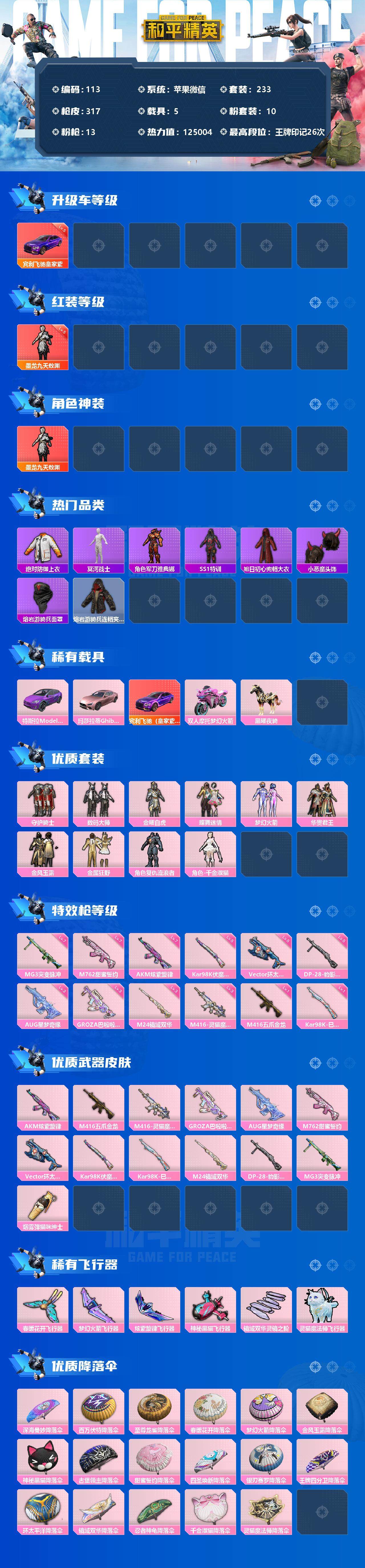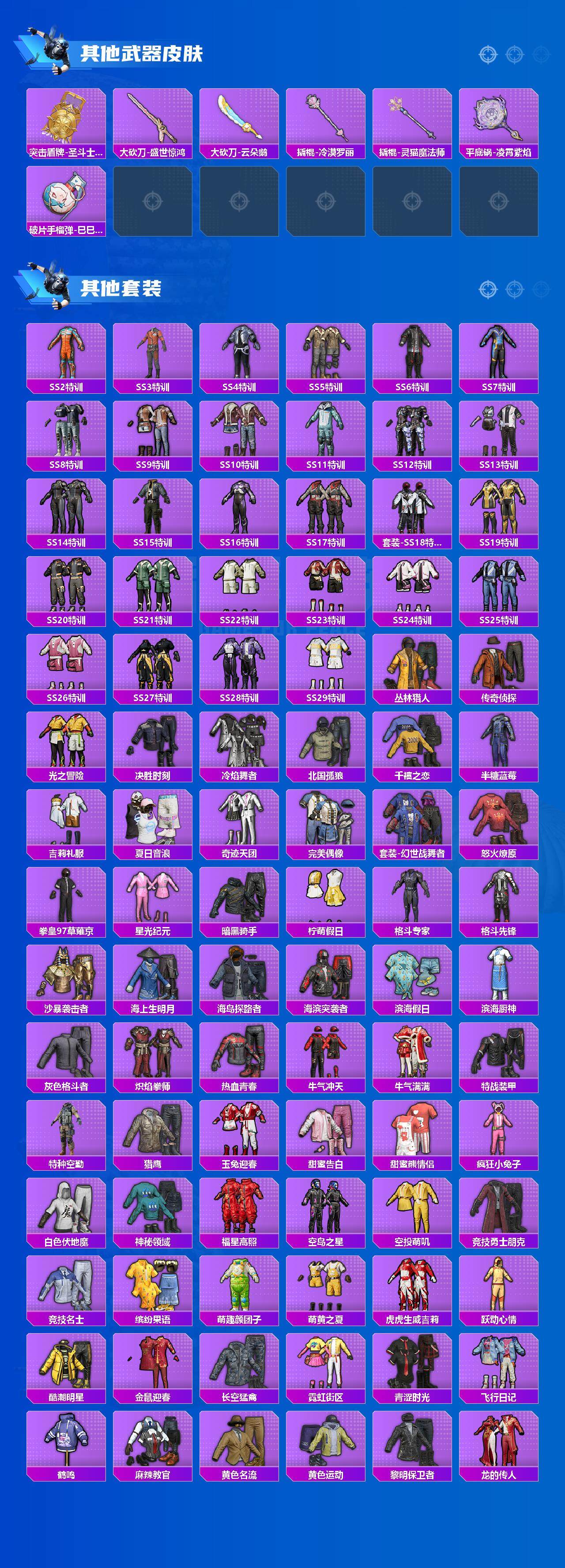 - [11347031]3特效枪 2印记 可二次 可修改实名 身法装备:8号机(新粉螳螂),Mark.06(新蓝螳螂) 优质装备:AUG-暖羊咩咩,Kar98K-巳巳如意 热门装扮:鹰眼刺客 稀有枪皮:DP-28-豹影疾电 五级特效枪:五级Kar98K-巳巳如意,五级DP-28-豹影疾电,五级AUG-暖羊咩咩 紫色装扮:SS22特训,SS23特训,幻彩翩翩,SS21特训,SS31特训套装,冰川特警,云朵鹅,彩虹兔,雪绒豹,SS33特训套装,灵公主,长空猛禽,缤纷果语,魅力单车,麻辣教官,黄色名流,黑色伏地魔,龙的传人,冰河战士,龙魂突击队,蝶变,海岛探路者,湖蓝色名流,白色伏地魔,甜蜜告白,灰色格斗者,猛禽,米开朗基罗,8号机(新粉螳螂),Mark.06(新蓝螳螂),异域银装,玉兔迎春,竞技名士,街头风暴,惊鸿侠骨,SS25特训,锦衣飞扬,焰鹰斗篷,幻羽潜行,智谋强哥,SS32特训服(SS32特训套装),白糯汤圆,恋语绒绒 优质战备:霓虹漫游降落伞,音爆索尼克降落伞,梦幻火箭降落伞