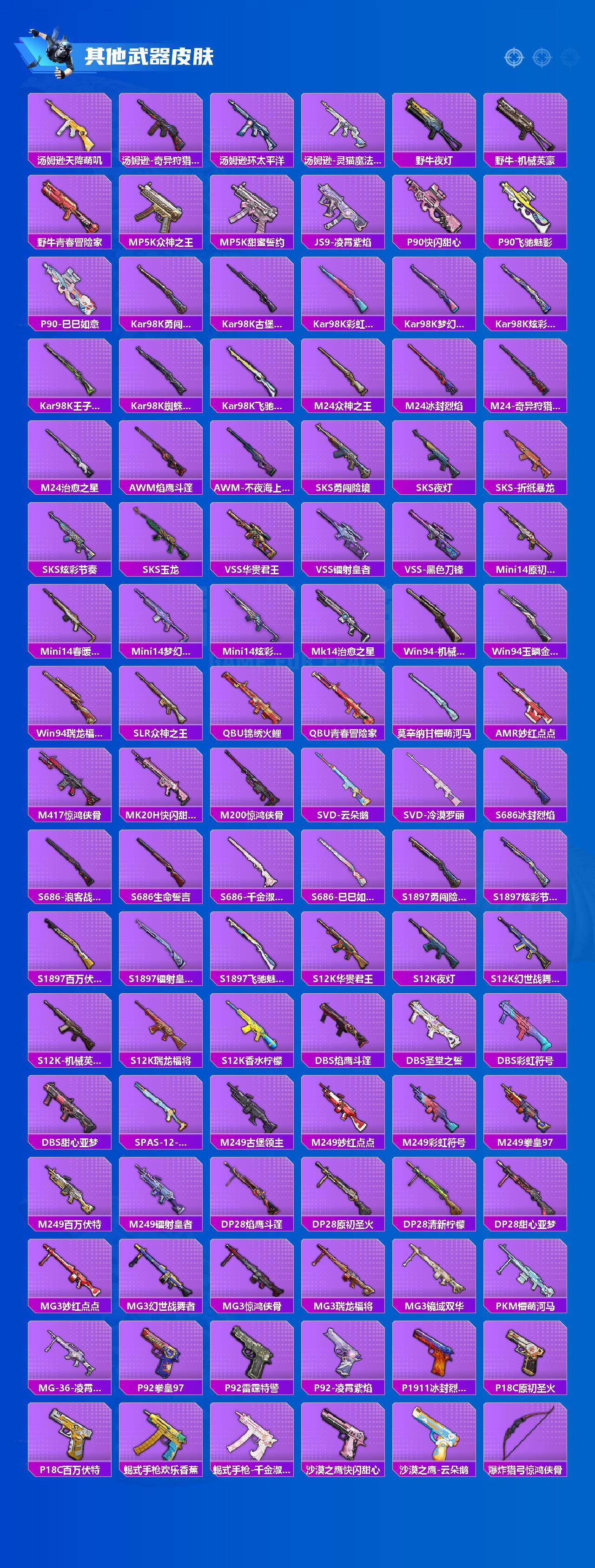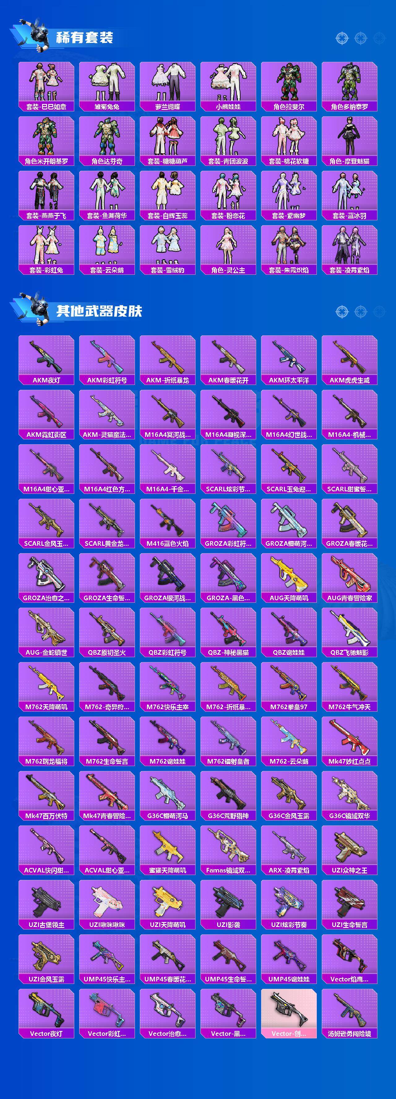 AKM-炫紫旋律,M416-五爪金龙,GROZA-巴啦啦小魔仙,AUG-星梦奇缘,M762-甜蜜誓约,Vector-环太平洋,Kar98K-伏魔团,Kar98K-巳巳如意,M24-镜域双华,MG3-突变脉冲,烟雾弹-猫咪绅士