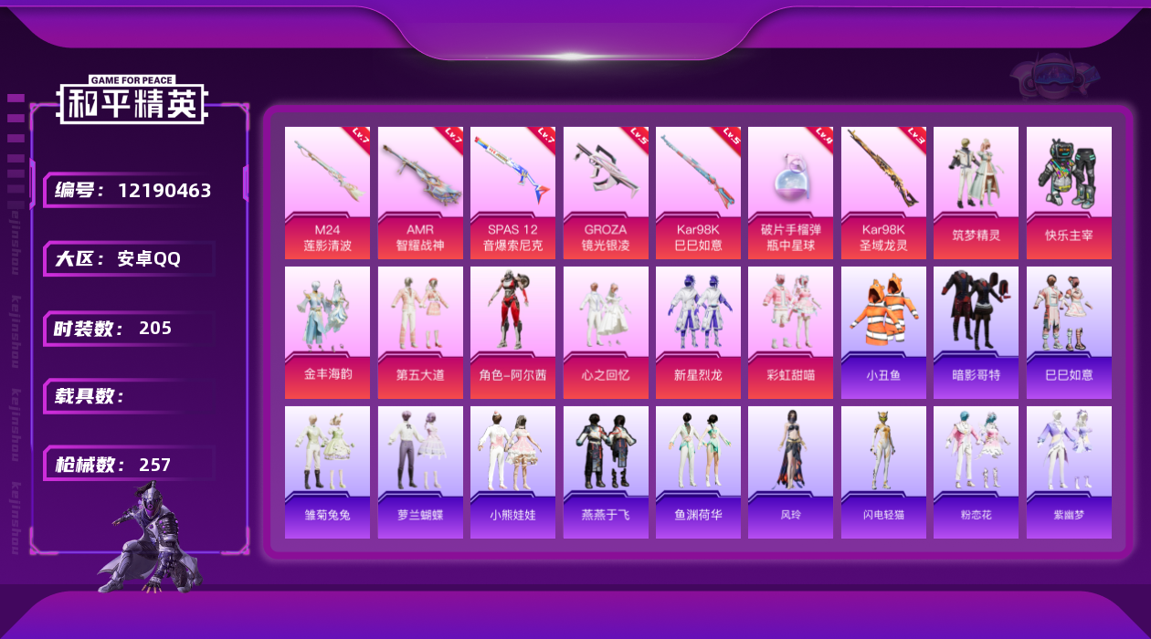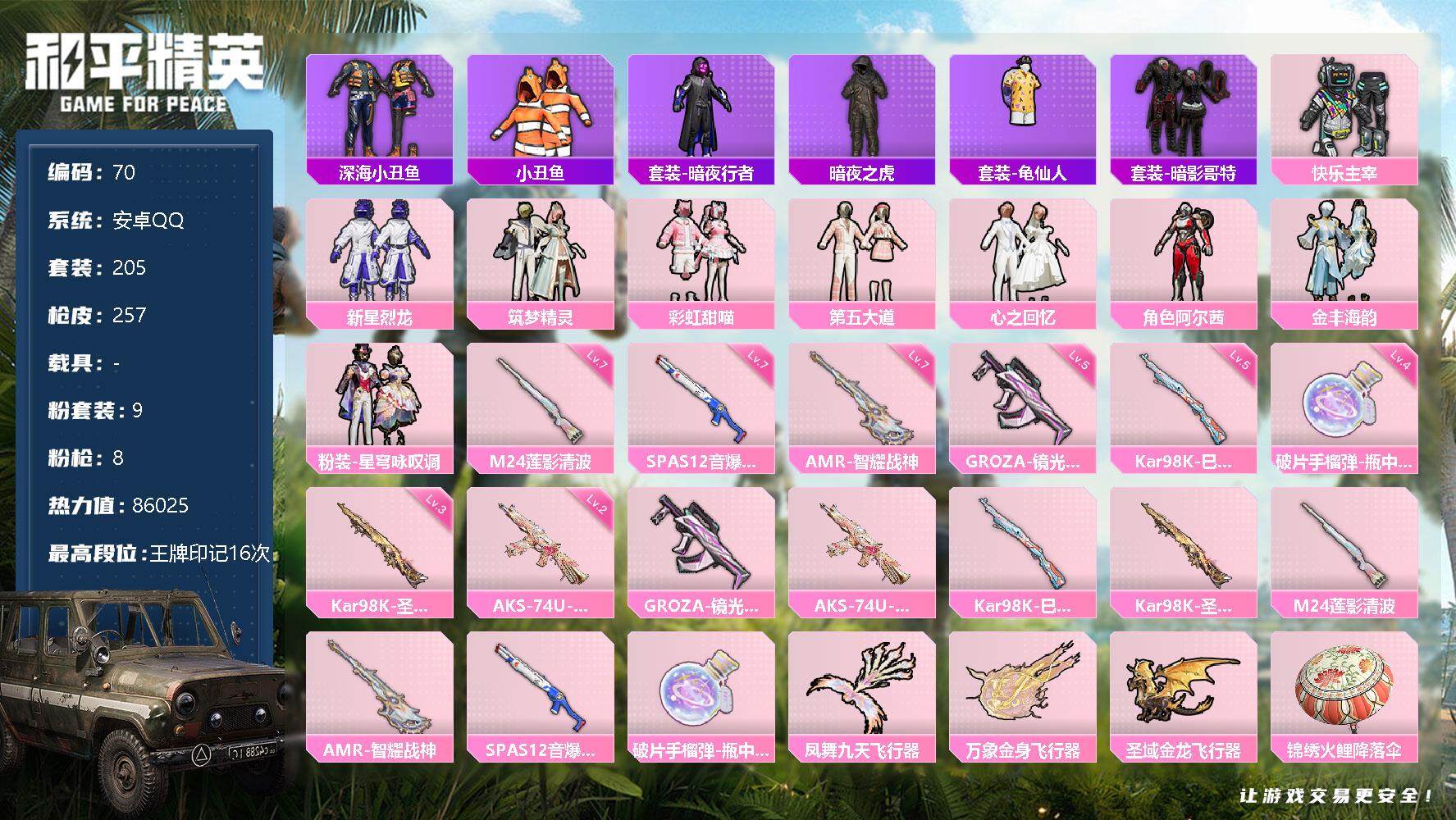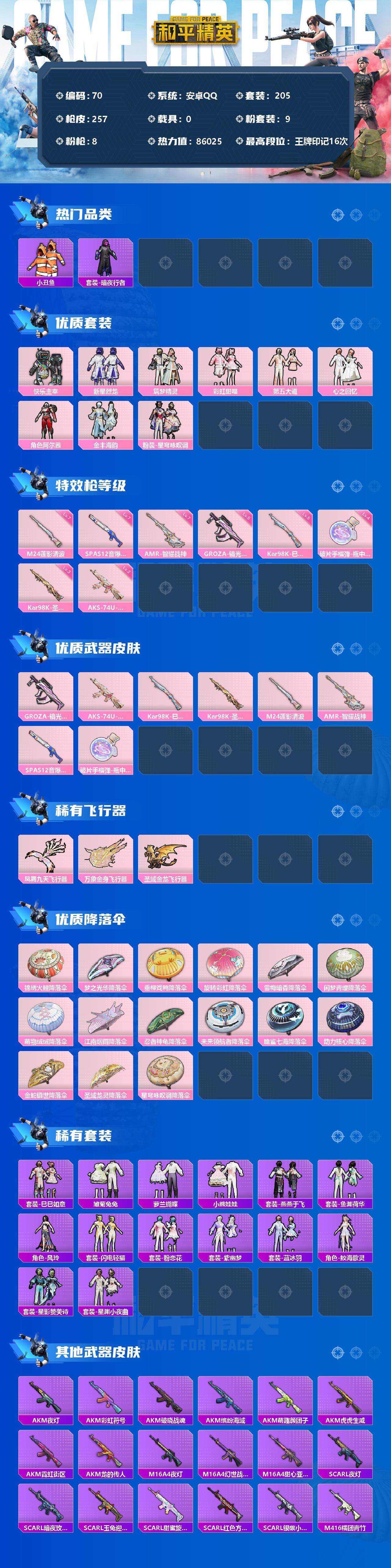 [12190463]身法素材号【特价急出/详情看图】:安卓 手Q-9粉装-8特效枪-0载具-3粉色飞行器-86025热力值-16王牌印记-205套装-257枪皮