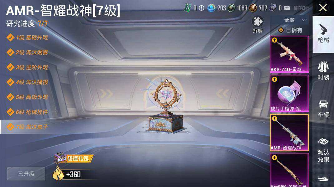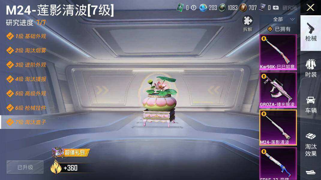 【粉色枪皮等级】:GROZA-镜光银凌(五级),AKS-74U-星穹咏叹调(二级),Kar98K-巳巳如意(五级),Kar98K-圣域龙灵(三级),M24-莲影清波(七级),AMR-智耀战神(七级),SPAS-12-音爆索尼克(七级),破片手榴弹-瓶中星球(四级)