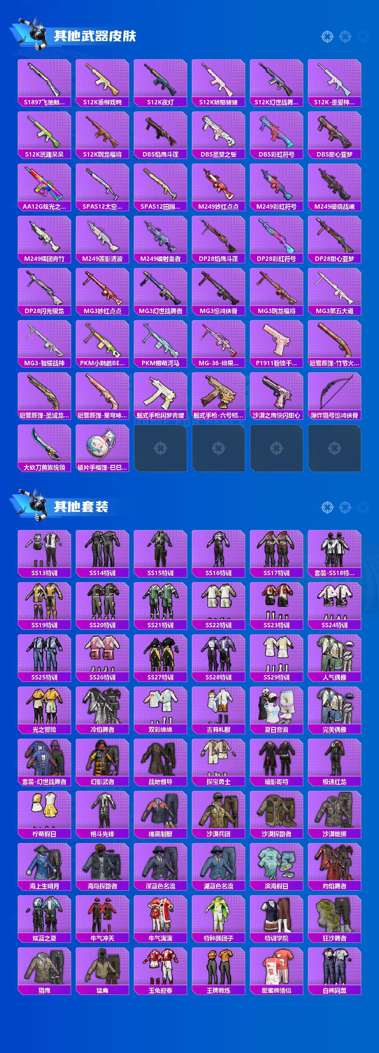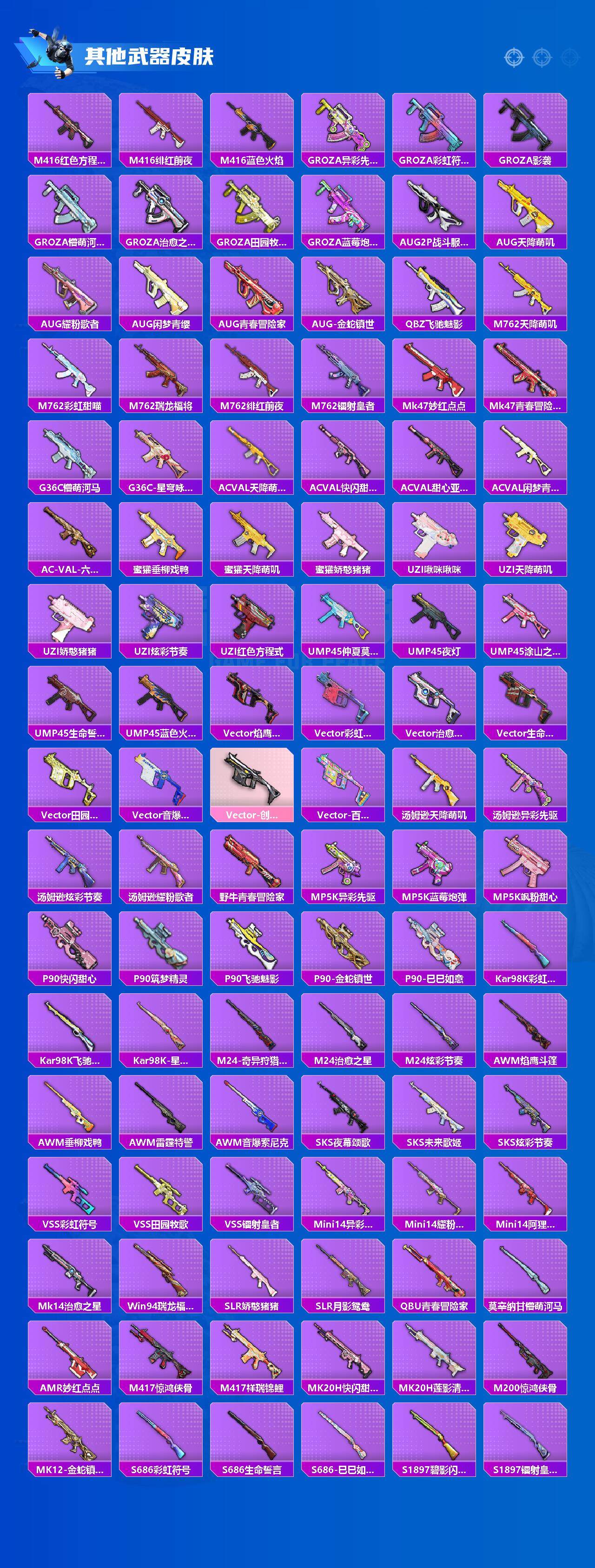 【稀有枪皮】:AKM-夜灯,AKM-彩虹符号,AKM-破晓战魂,AKM-缤纷海域,AKM-萌趣颜团子,AKM-虎虎生威,AKM-霓虹街区,AKM-龙的传人,M16A4-夜灯,M16A4-幻世战舞者,M16A4-甜心亚梦,SCAR-L-夜灯,SCAR-L-暗夜玫瑰,SCAR-L-玉兔迎春,SCAR-L-甜蜜旋律,SCAR-L-红色方程式,SCAR-L-银碳小老虎,M416-糯团青竹,M416-红色方程式,M416-绯红前夜,M416-蓝色火焰,GROZA-异彩先驱,GROZA-彩虹符号,GROZA-影袭,GROZA-懵萌河马,GROZA-治愈之星,GR