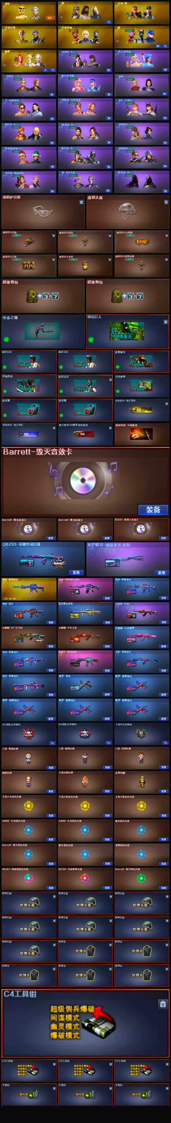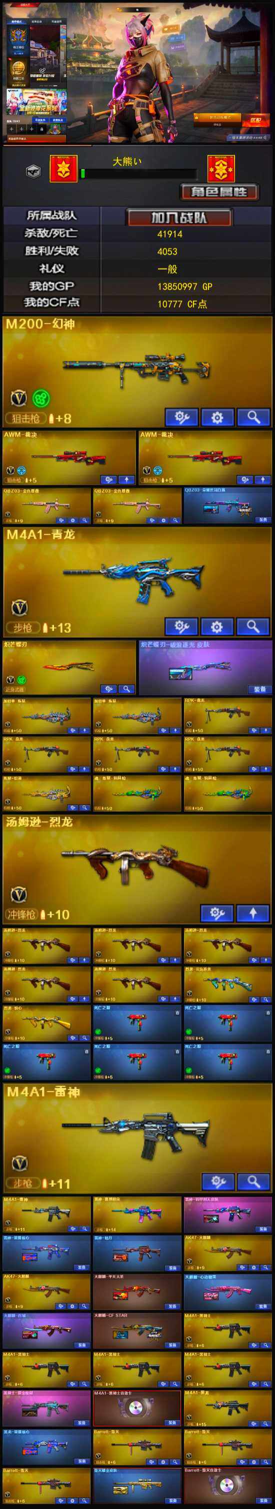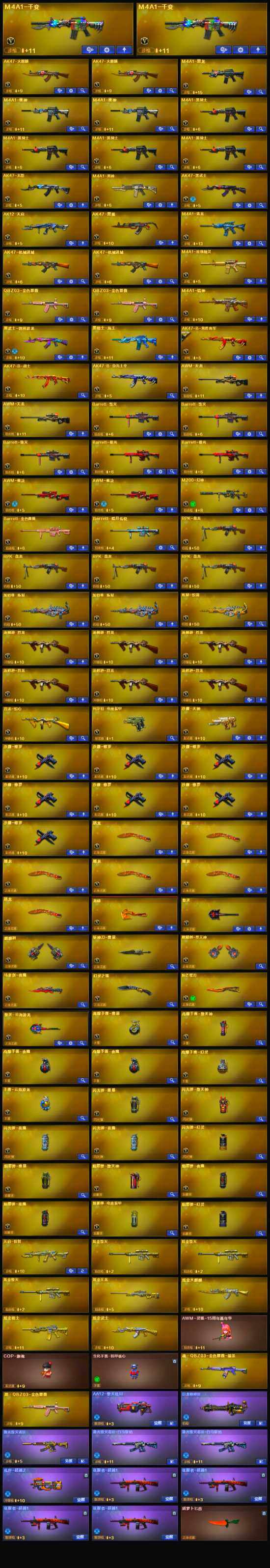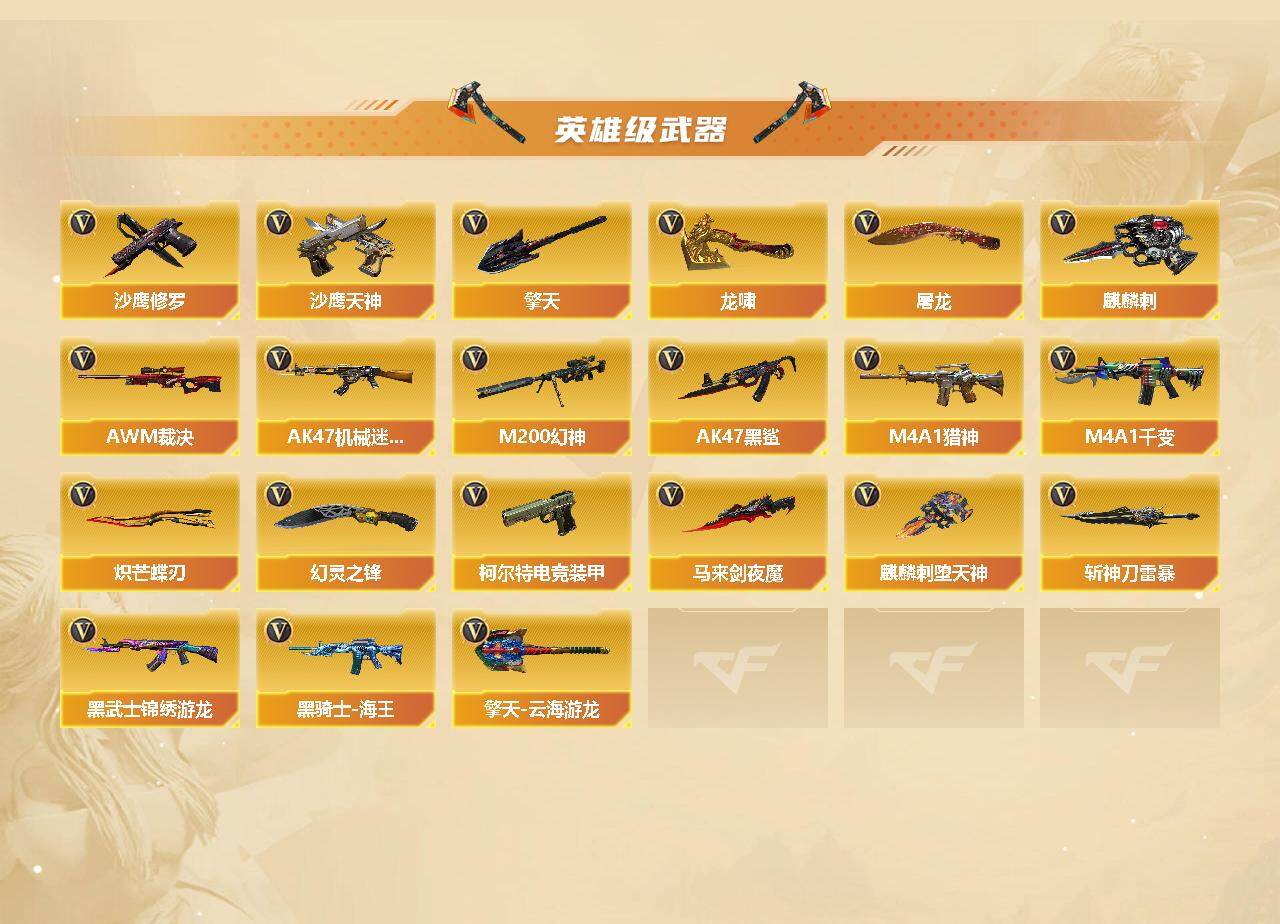 【英雄级武器】:幻灵之锋,柯尔特-电竞装甲,马来剑-夜魔,麒麟刺-堕天神,斩神刀-雷暴,QBZ03-金色蔷薇*2,M4A1-青龙,M4A1-雷神*2,M4A1-黑龙,M4A1-玫瑰精灵,M4A1-黑骑士*4,M4A1-死神,RPK-盘龙*4,加特林-炼狱*2,汤姆逊-烈龙*6,AK47-无影,AK47-火麒麟*2,AK47-黑武士,AK12-天启,AWM-天龙*2,Barrett-毁灭*3,Barrett-极光*2,AWM-裁决*2,AK47-机械迷城*2,M200-幻神,AK47-黑鲨,M4A1-猎神,M4A1-千变*2,黑武士-锦绣游龙,黑骑士-海王,AK47-B-常胜将军,沙鹰-天神,沙鹰-修罗*7,炽芒蝶刃,麒麟刺,擎天,龙啸,屠龙*6,擎天-云海游龙