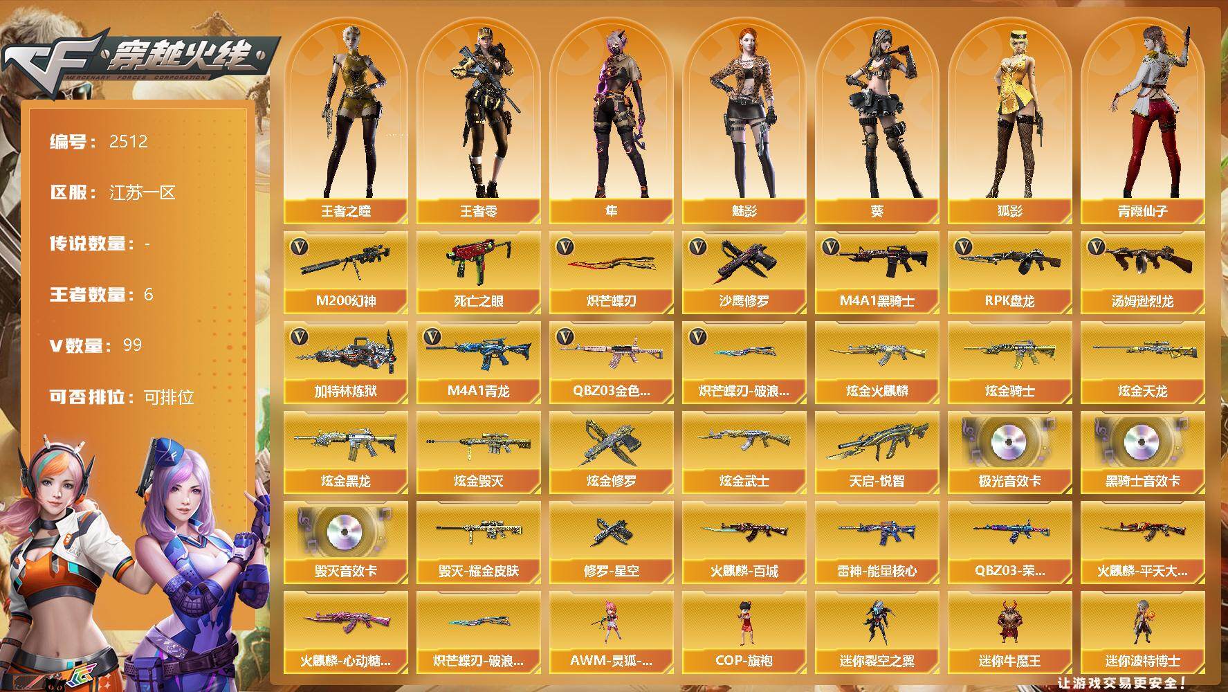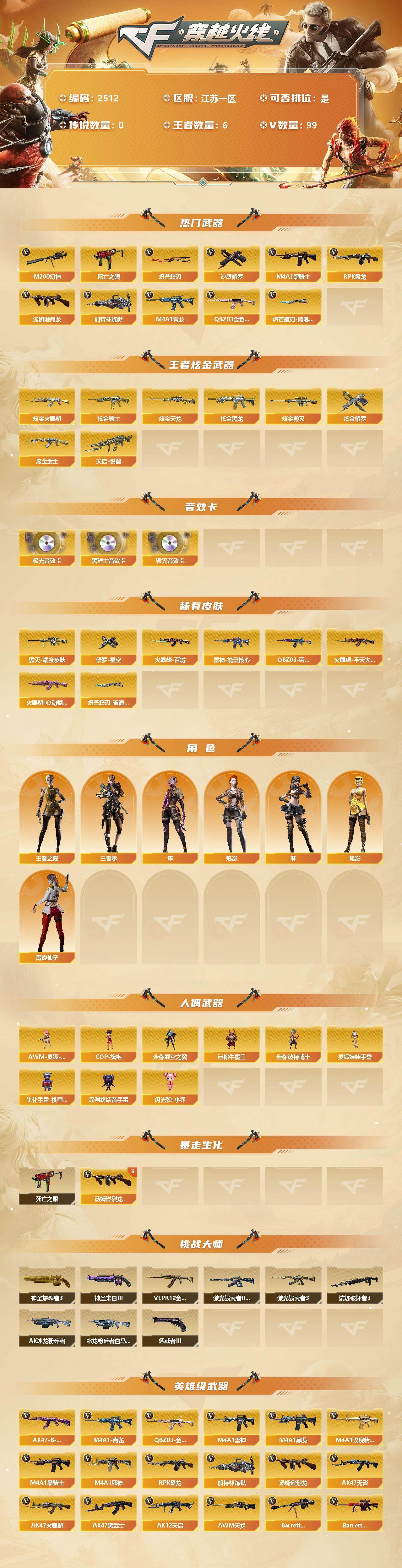 [12191006]【商品标题】:江苏一区-99V-6王者-9炫金 【热门武器】:QBZ03-金色蔷薇*2,M4A1-青龙,M200-幻神,死亡之眼*5,M4A1-黑骑士*4,汤姆逊-烈龙*6,RPK-盘龙*4,加特林-炼狱*2,沙鹰-修罗*7,炽芒蝶刃,炽芒蝶刃-破浪逐光 皮肤 【王者炫金武器】:炫金火麒麟,炫金骑士,炫金天龙,炫金黑龙,炫金毁灭*3,炫金修罗,炫金武士,天启-悦智 【音效卡】:M4A1-黑骑士音效卡,Barrett-毁灭音效卡,Barrett-极光音效卡*2 【稀有皮肤】:QBZ03-荣耀世冠白鲨,雷神-能量核心,火麒麟-平天大圣*2,火麒麟-百城,火麒麟-心动糖果,毁灭耀金皮肤,修罗-星空,炽芒蝶刃-破浪逐光 皮肤 【角色】:王者-零,王者之瞳,狐影,葵,魅影,隼,青霞仙子 【人偶武器】:AWM-灵狐-15周年嘉年华,COP-旗袍,迷你裂空之翼,迷你牛魔王,迷你波特博士,灵狐娃娃手雷,生化手雷-机甲核心,深渊终结者手雷*2,闪光弹-小乔 【暴走生化】:死亡之眼*5 【挑战大师】:神圣爆裂者III,神圣爆裂者-末日III*2,惩戒者III,试炼破坏者III,激光毁灭者III,VEPR-12-金魔,激光毁灭者III-白马银枪*2,AK47-冰龙粉碎者,冰龙粉碎者-白马银枪 【英雄级武器】:幻灵之锋,柯尔特-电竞装甲,马来剑-夜魔,麒麟刺-堕天神,斩神刀-雷暴,QBZ03-金色蔷薇*2,M4A1-青龙,M4A1-雷神*2,M4A1-黑龙,M4A1-玫瑰精灵,M4A1-黑骑士*4,M4A1-死神,RPK-盘龙*4,加特林-炼狱*2,汤姆逊-烈龙*6,AK47-无影,AK47-火麒麟*2,AK47-黑武士,AK12-天启,AWM-天龙*2,Barrett-毁灭*3,Barrett-极光*2,AWM-裁决*2,AK47-机械迷城*2,M200-幻神,AK47-黑鲨,M4A1-猎神,M4A1-千变*2,黑武士-锦绣游龙,黑骑士-海王,AK47-B-常胜将军,沙鹰-天神,沙鹰-修罗*7,炽芒蝶刃,麒麟刺,擎天,龙啸,屠龙*6,擎天-云海游龙 【特殊枪械】:4黑骑士,6烈龙,4盘龙,2炼狱