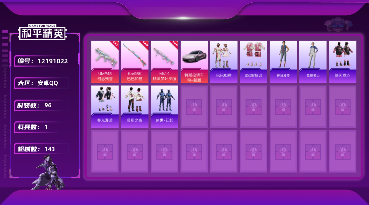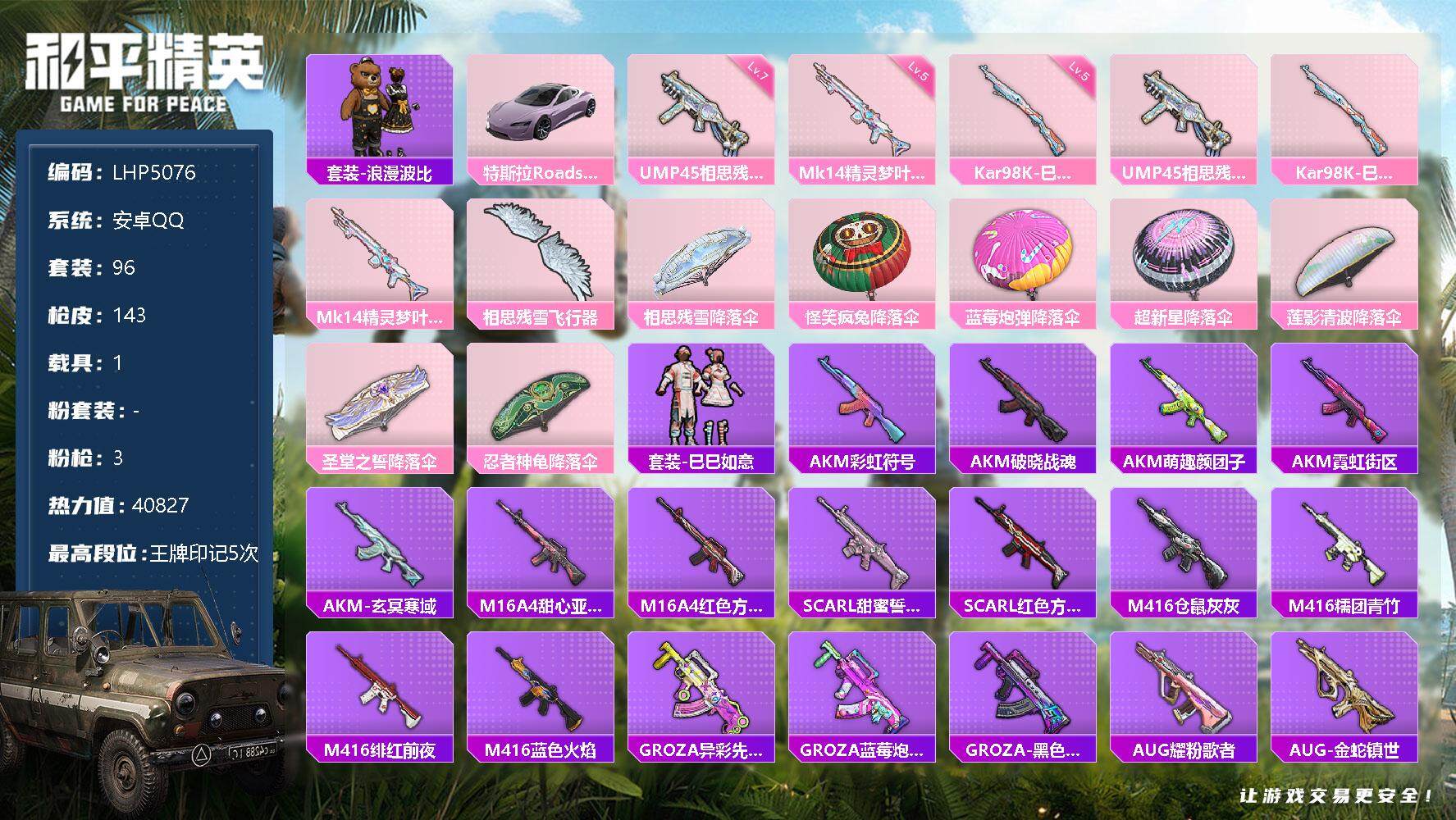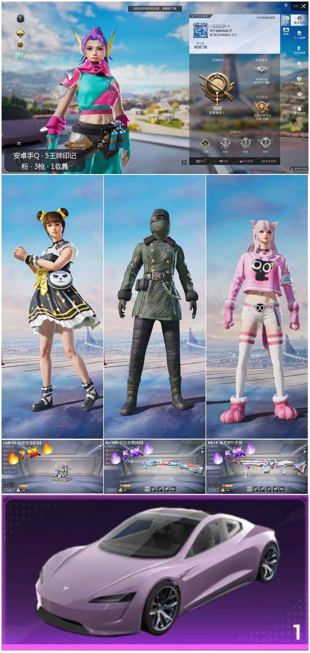[12191022]【特价急出/详情看图】:安卓 手Q-3特效枪-1载具-1粉色飞行器-4w热力值-5王牌印记-96套装-143枪皮【热门品类】:套装-浪漫波比【粉色载具】:特斯拉Roadster(沁心粉)【粉色枪皮等级】:UMP45-相思残雪(七级),Kar98K-巳巳如意(五级),Mk14-精灵梦叶罗丽(五级)【粉色枪皮】:UMP45-相思残雪,Kar98K-巳巳如意,Mk14-精灵梦叶罗丽【粉色飞行器】:相思残雪飞行器