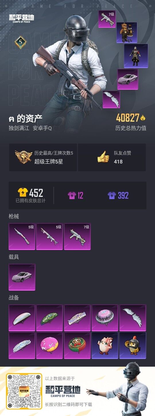 - PX_2081134-时装数: 377 载具数: 1 枪械数: 156 战备数: 106 热门装扮: 奇异狩猎者,鹰眼刺客,都市猎人,洛天依,第五大道,飒粉甜心,黄族统领,小可学妹,呆萌星弥,天星战神 载具: 玛莎拉蒂Quattroporte(夜幕蓝) 稀有枪皮: MG3梦幻舞会【7级】,MK14闲梦青缨【7级】,Kar98K-巳巳如意【4级】